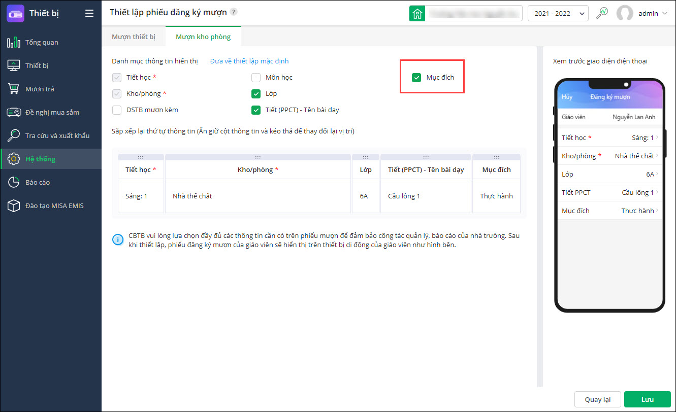 (Xem hướng dẫn chi tiết tại đây) - Tại Hệ thống\Thiết lập\Phiếu đăng ký mượn\Mượn kho phòng: bổ sung giá trị Mục đích để cán bộ thiết bị tùy chọn hiển thị theo nhu cầu quản lý tại đơn vị.
