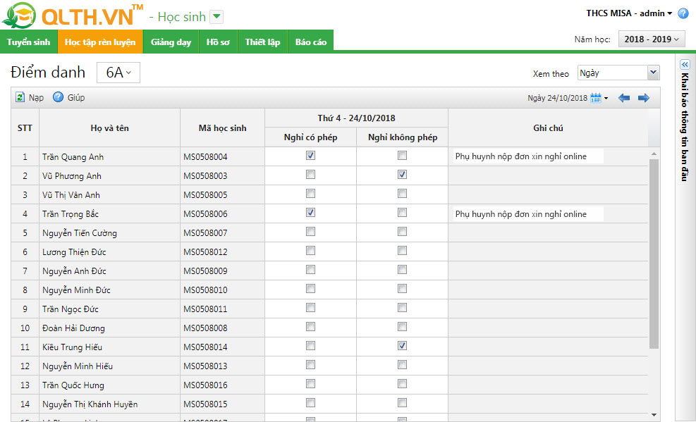 - Đối với các phụ huynh nộp đơn xin nghỉ phép qua ứng dụng mobile thì mặc định là Nghỉ có phép và kèm theo ghi chú “Phụ huynh nộp đơn xin nghỉ online“.