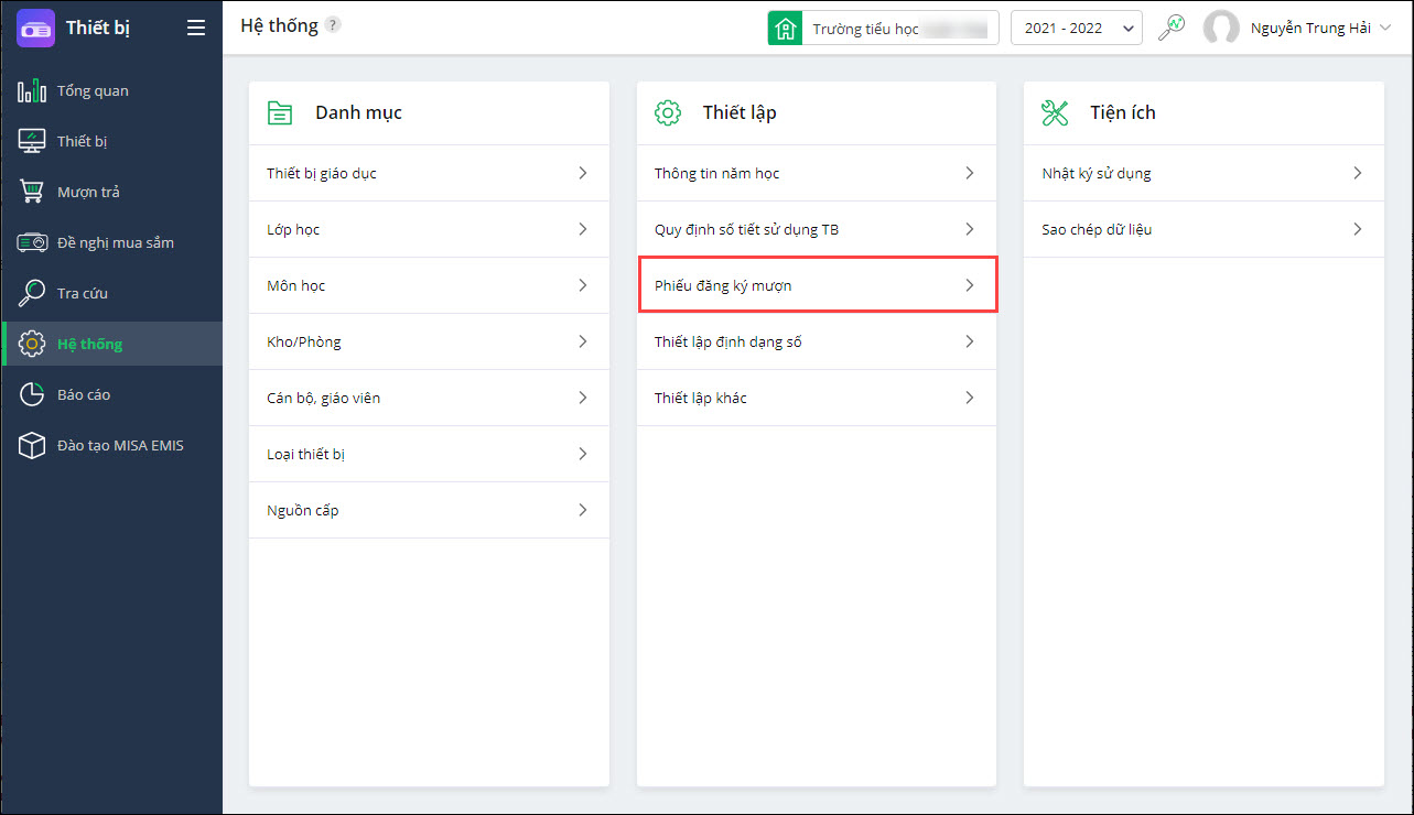 - Vào Hệ thống\Thiết lập\Phiếu đăng ký mượn.