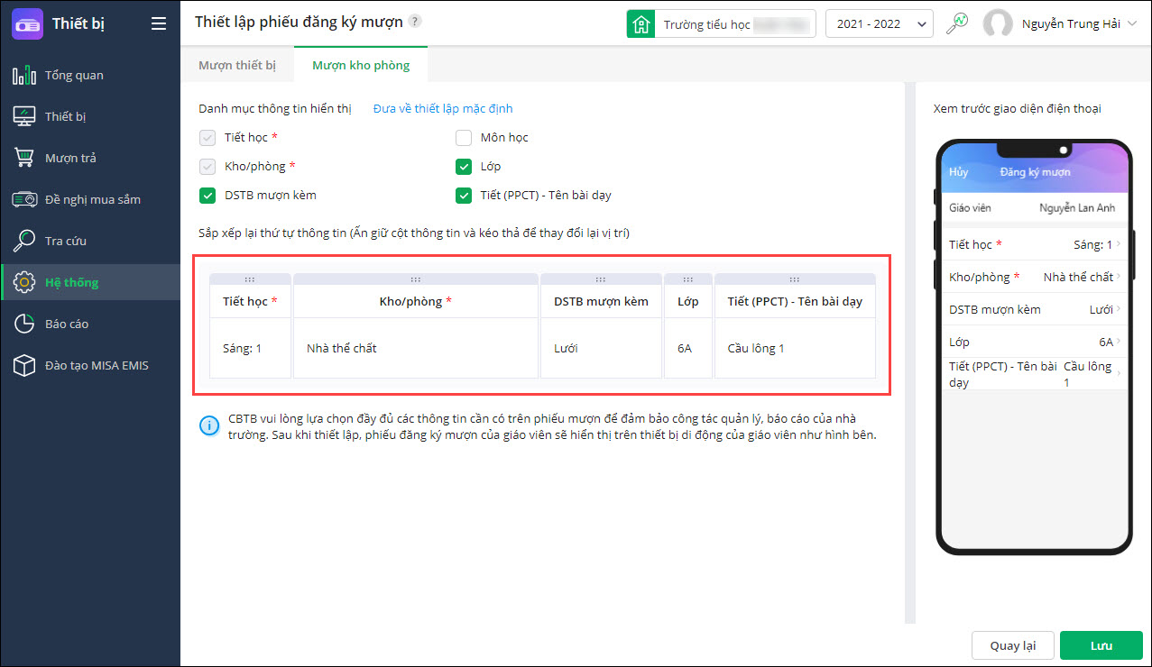 - Nhấn vào Xem trước đăng ký mượn trên điện thoại sau khi thiết lập để xem giao diện phiếu mượn hiển thị trên ứng dụng SISAP Giáo viên.