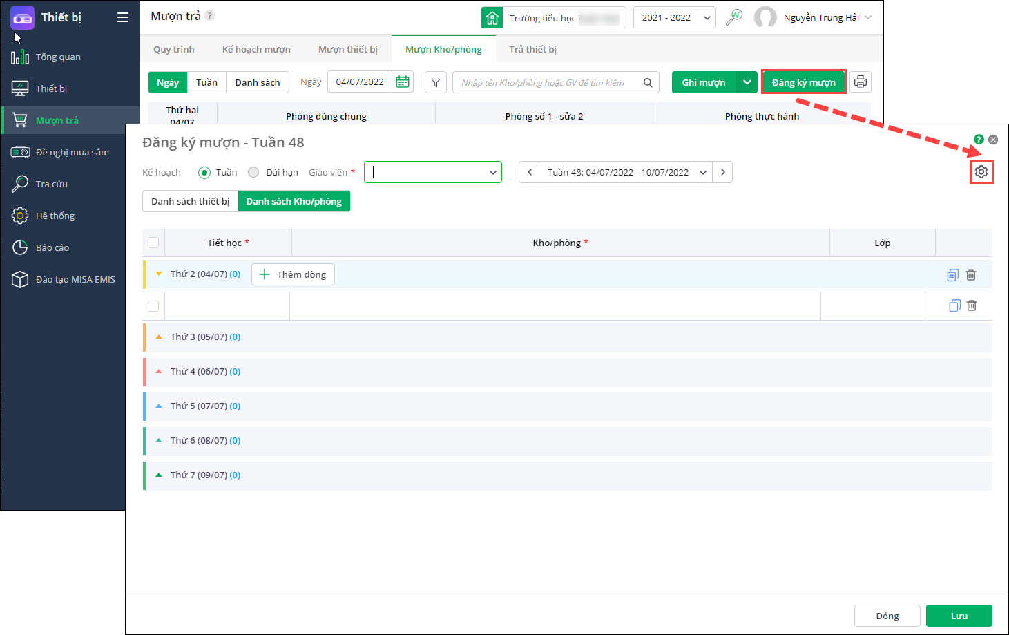 - Vào Mượn trả\Mượn thiết bị\Đăng ký mượn. Cán bộ thiết bị có thể thiết lập hiển thị và sắp xếp thông tin trên phiếu đăng ký mượn kho phòng bằng cách nhấn vào biểu tượng bánh răng trên góc phải màn hình.