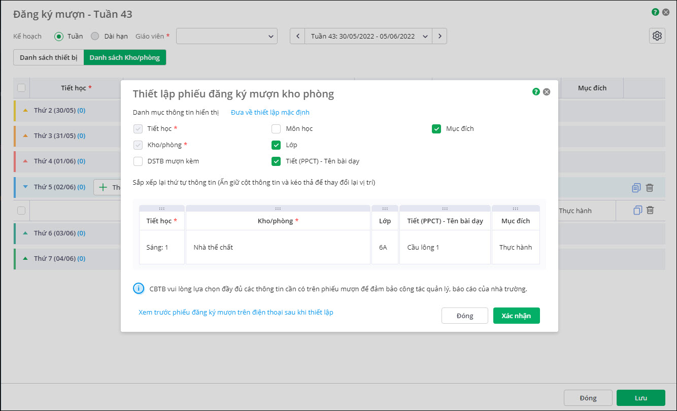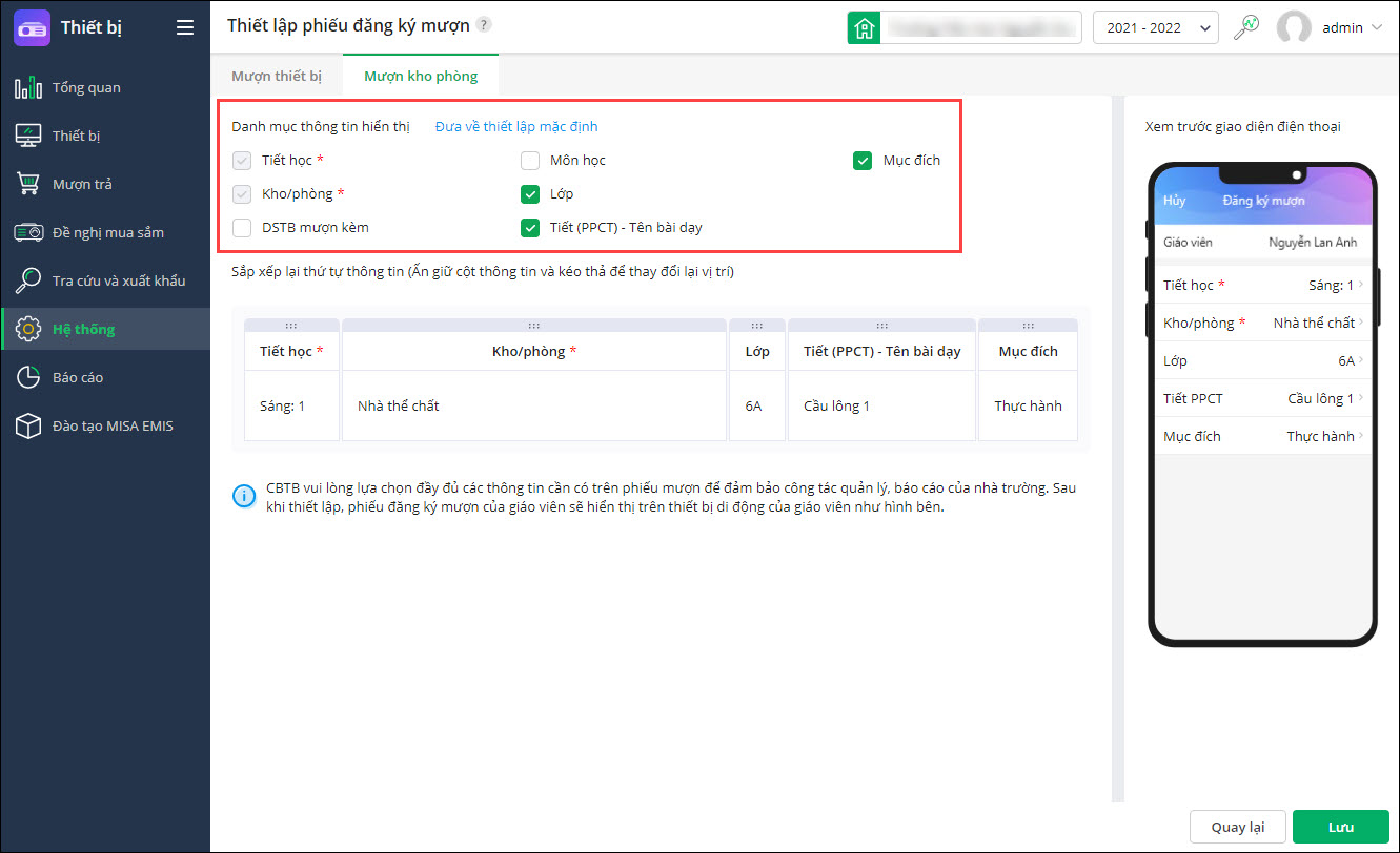 - Sau khi thiết lập thông tin, Cán bộ thiết bị có thể nhìn thấy giao diện hiển thị cho giáo viên bộ môn khi đăng ký mượn thiết bị (Trên Website và trên ứng dụng SISAP Giáo viên).