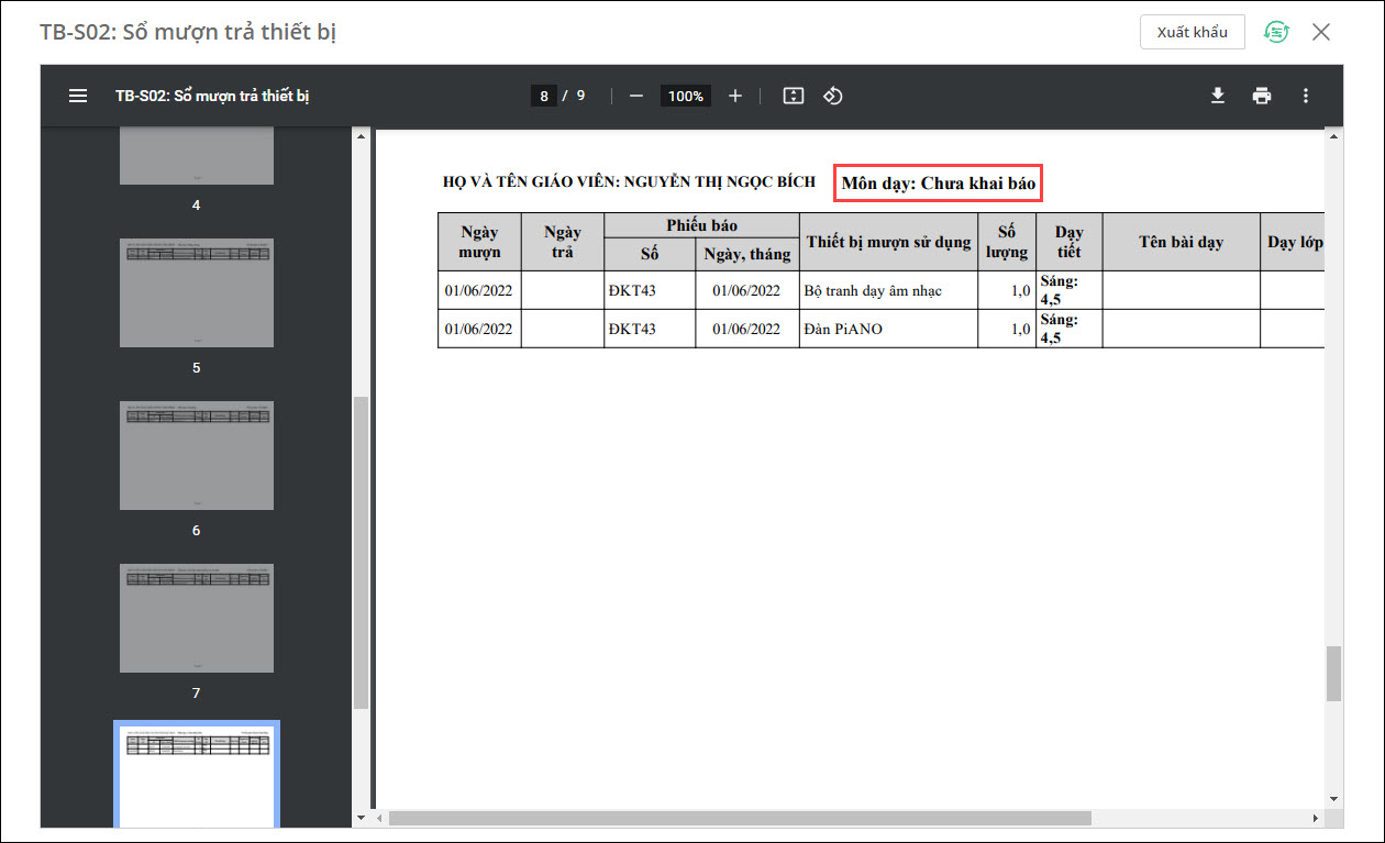 - Vào cuối kỳ/ năm/đột xuất có nhu cầu báo cáo, Cán bộ thiết bị sẽ xem Sổ mượn trả thiết bị những trang sổ của giáo viên bộ môn phát sinh mượn trả.