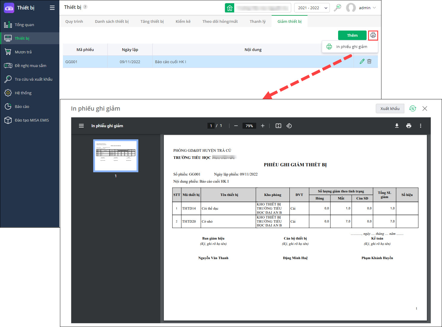 5. Cán bộ thiết bị mong muốn in được phiếu ghi giảm để báo cáo khi được yêu cầu để nộp cho Ban Giám hiệu nhà trường