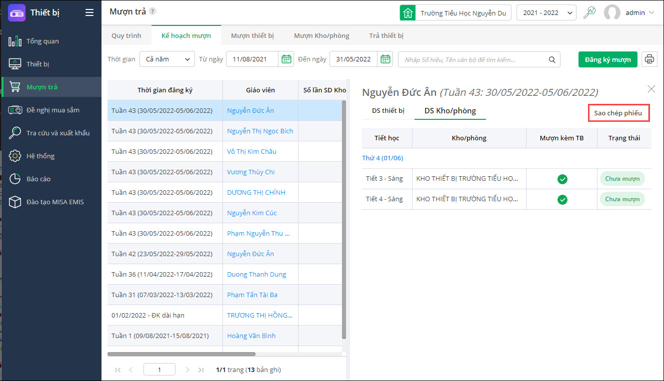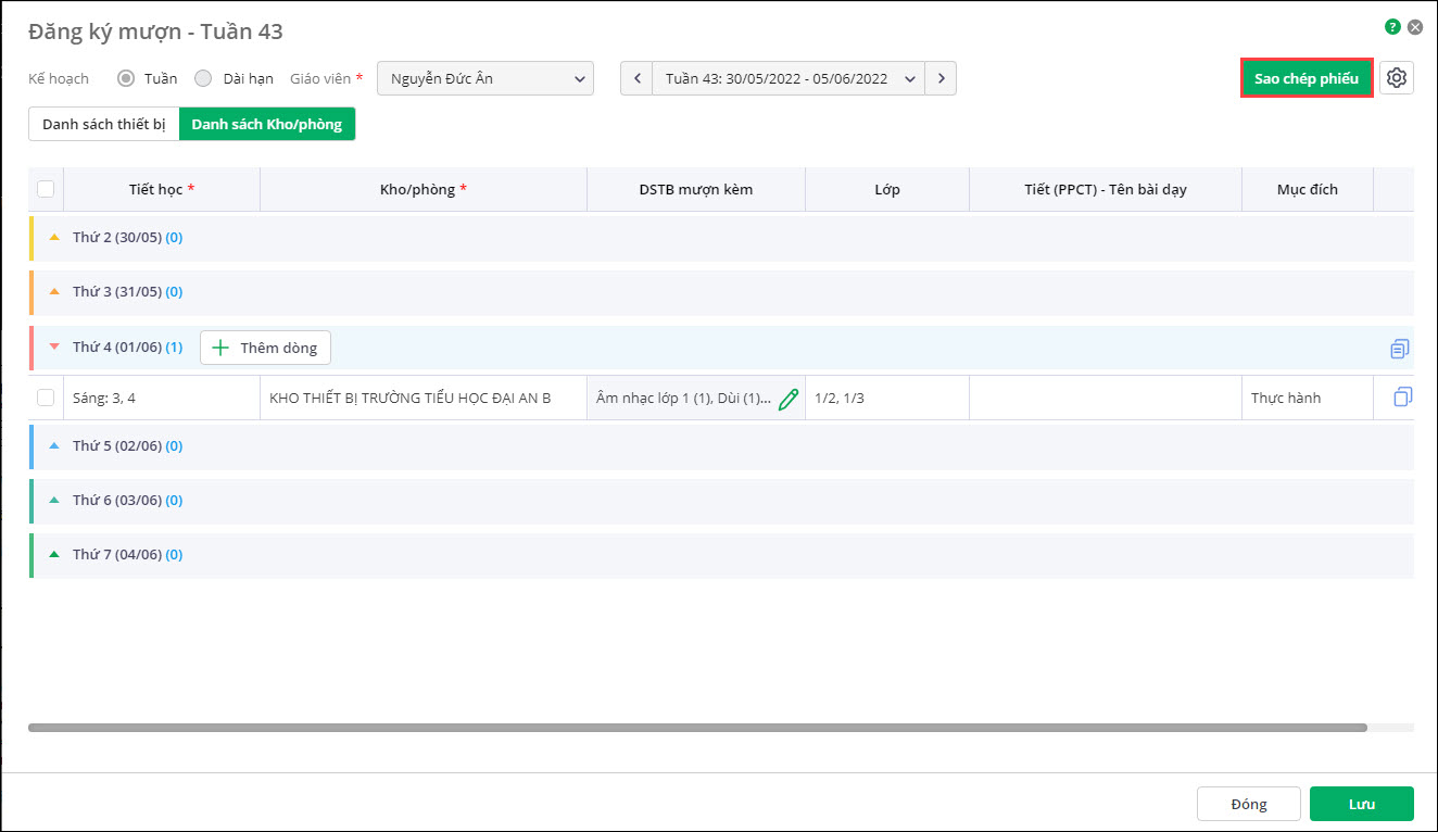 - Các thông tin được sao chép là Tiết học; Kho phòng; Danh sách thiết bị mượn kèm; Môn học; Lớp.