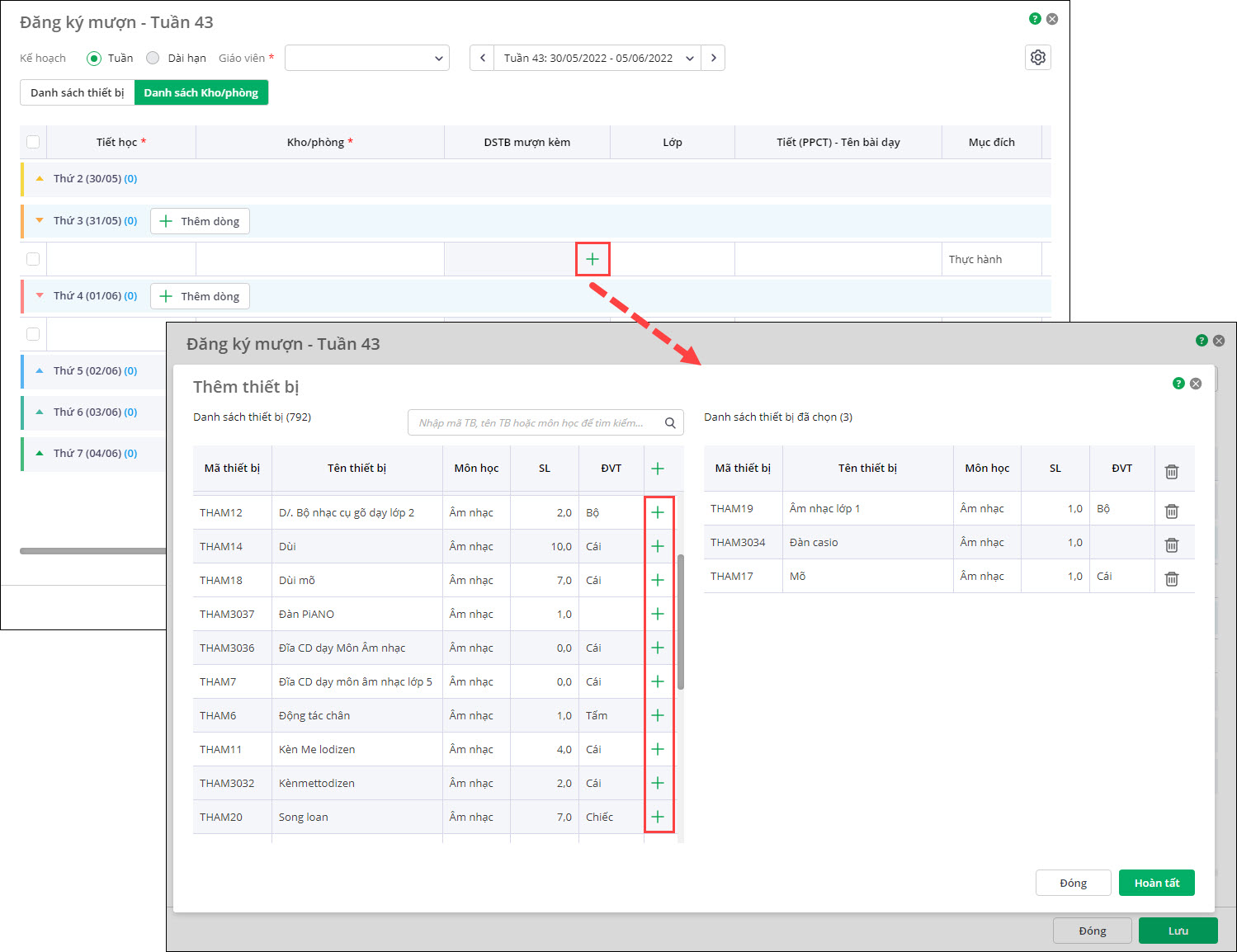 - Nếu đăng ký mượn tiết chưa có thông tin đăng ký mượn thiết bị: Cho phép Thêm thiết bị mượn kèm.