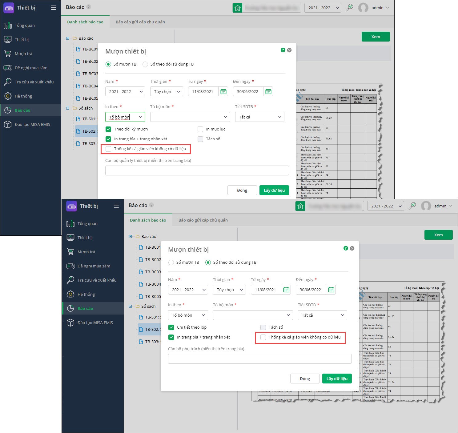 - Tại Báo cáo\TB-S02: Sổ mượn trả thiết bị, khi khai báo tham số bổ sung lựa chọn Thống kê cả giáo viên không có dữ liệu.
