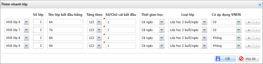 • Các lớp được đặt tên theo thứ tự A, B, C,… (VD: 7A, 7B, 7C). Thực hiện nhập Tên lớp bắt đầu bằng 7, Tăng theo ABC và Số/Chữ cái bắt đầu là A.