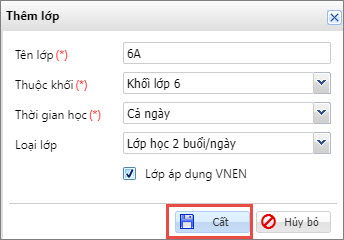 2. Khai báo thông tin lớp học. Tích chọn tại phần Lớp áp dụng VNEN