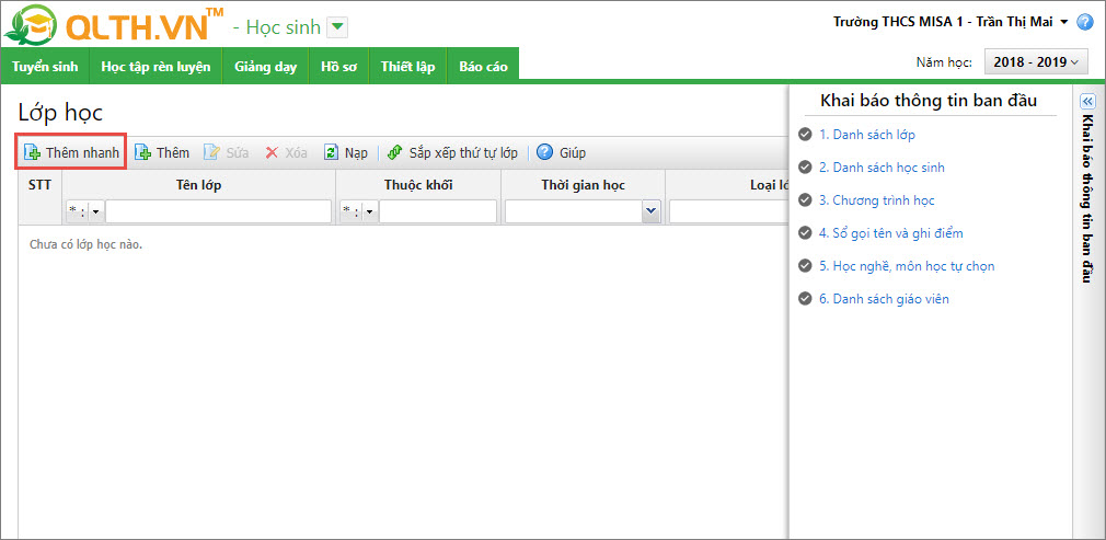 1. Nhấn vào biểu tượng  tại phần Khai báo thông tin ban đầu, chọn tab 1. Danh sách lớp.