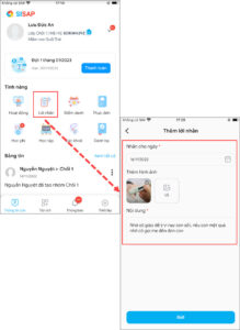 - Trên ứng dụng SISAP Phụ huynh, tại mục Lời nhắn, phụ huynh có thể thêm lưu ý cho giáo viên trong quá trình chăm sóc trẻ.