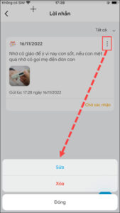 5. Trường hợp giáo viên chưa xác nhận lời nhắn và phụ huynh muốn thay đổi thông tin, anh/chị có thể nhấn vào biểu tượng dấu ba chấm và chọn Chỉnh sửa/Xóa lời nhắn.