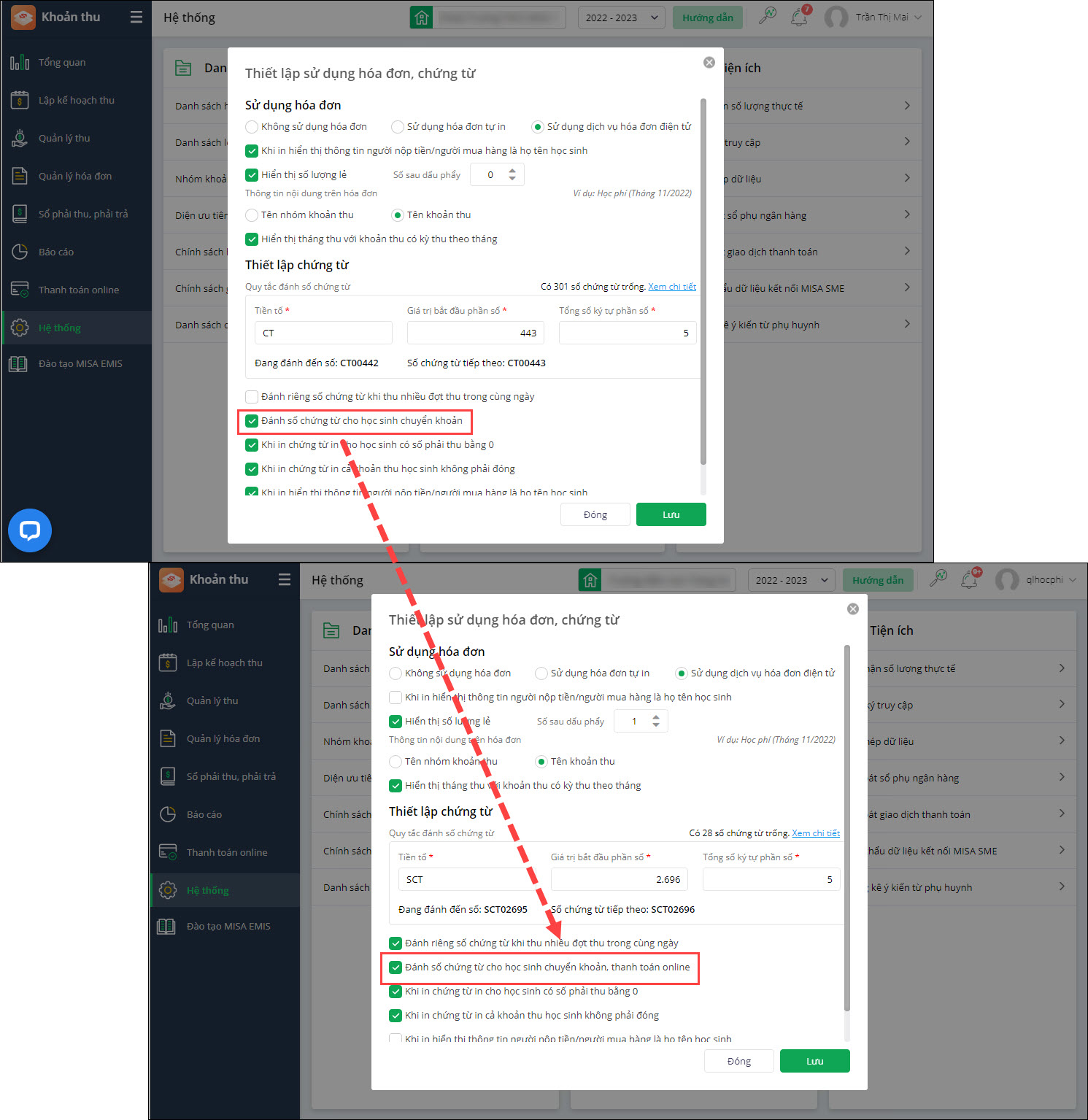 - Tại Hệ thống\Thiết lập sử dụng hóa đơn, chứng từ: Thay đổi text Đánh số chứng từ cho học sinh chuyển khoản thành Đánh số chứng từ cho học sinh chuyển khoản, thanh toán online.