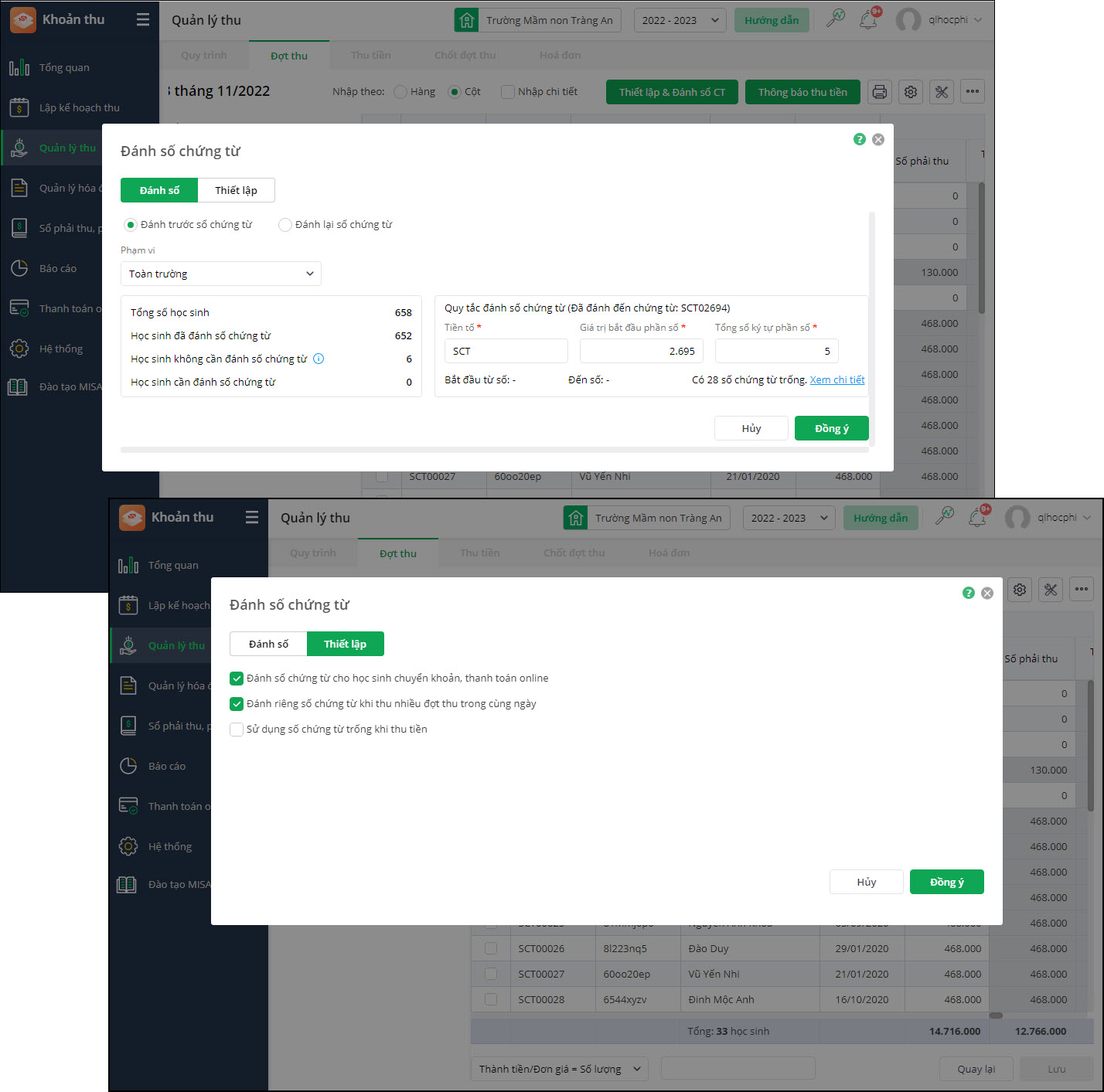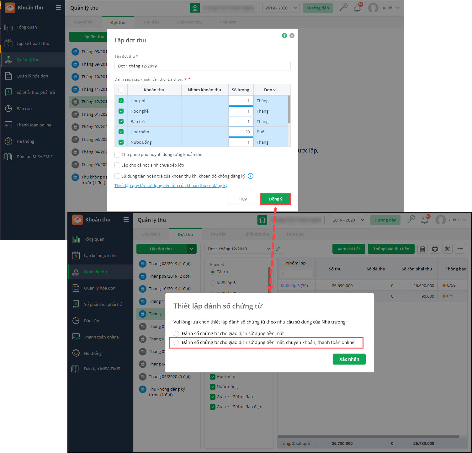 - Sau khi Lập đợt thu mới, hiển thị Thiết lập đánh số chứng từ để kế toán chọn.