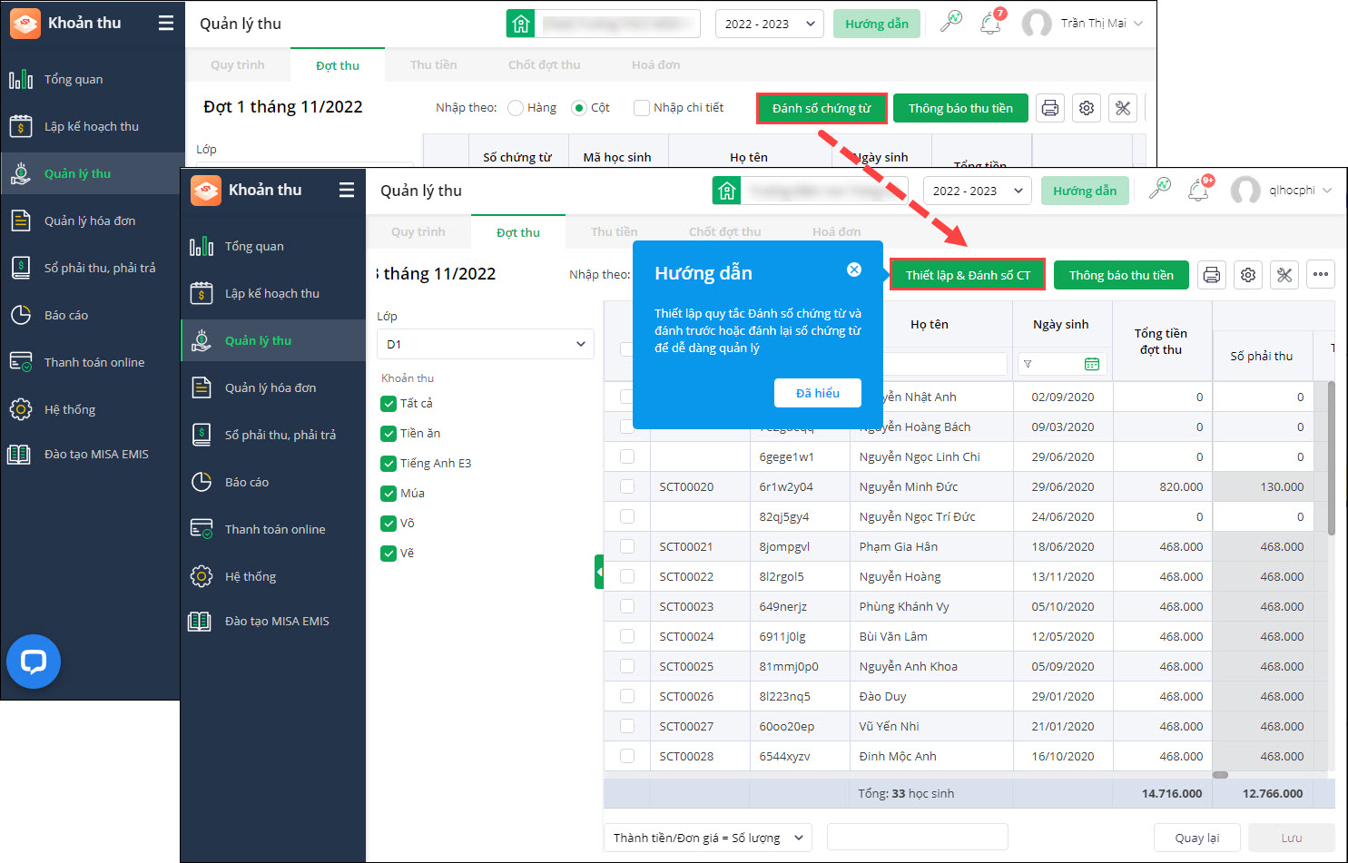 - Tại màn Xem chi tiết từng đợt thu: Đổi tên button Đánh số chứng từ thành Thiết lập & Đánh số chứng từ.