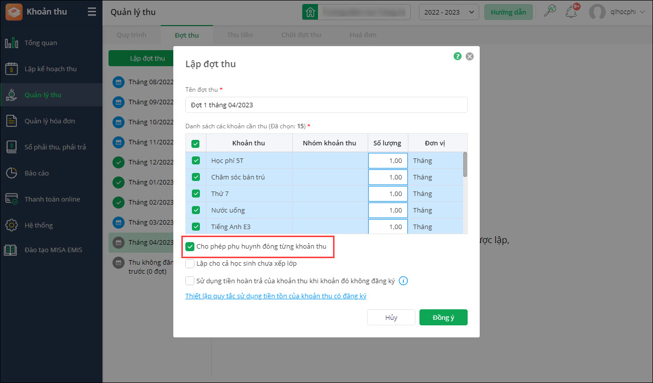 - Tại mục Quản lý thu\Lập đợt thu: Bổ sung tùy chọn Cho phép phụ huynh đóng từng khoản thu khi kế toán lập đợt thu mới. (Xem hướng dẫn chi tiết tại đây)