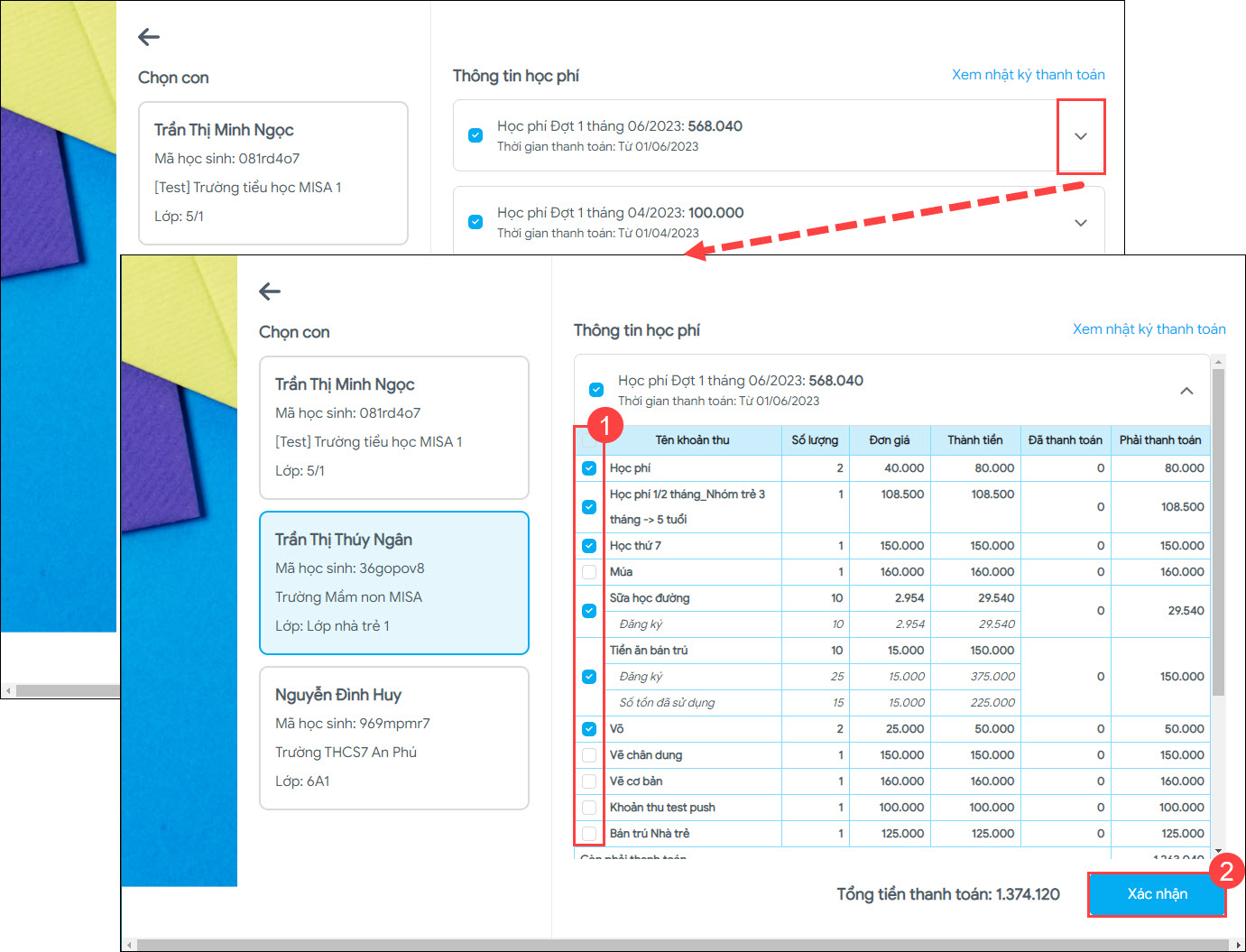 1. Phụ huynh mong muốn lựa chọn được từng khoản thu muốn đóng trong từng lần thanh toán để phù hợp với điều kiện tài chính và nhu cầu sử dụng của học sinh