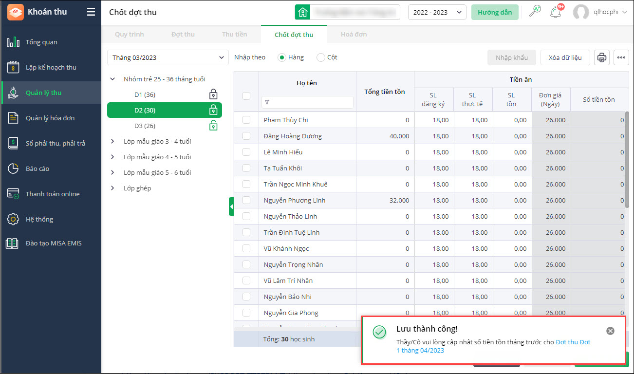 - Khi chọn cập nhật số tiền tồn sẽ điều hướng sang đợt thu mới nhất và tính năng Cập nhật miễn giảm, lớp học, tiền tồn cho Học sinh.