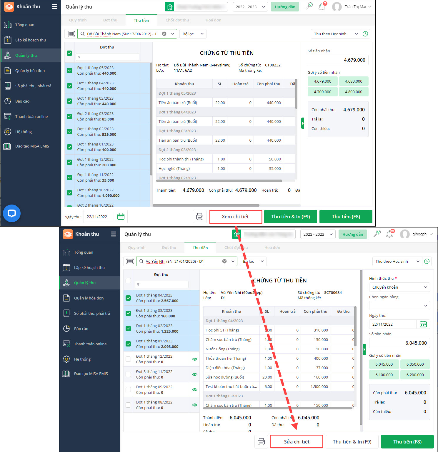 - Phần mềm cho phép chỉnh sửa hình thức thu tiền của học sinh trước khi thu tiền.