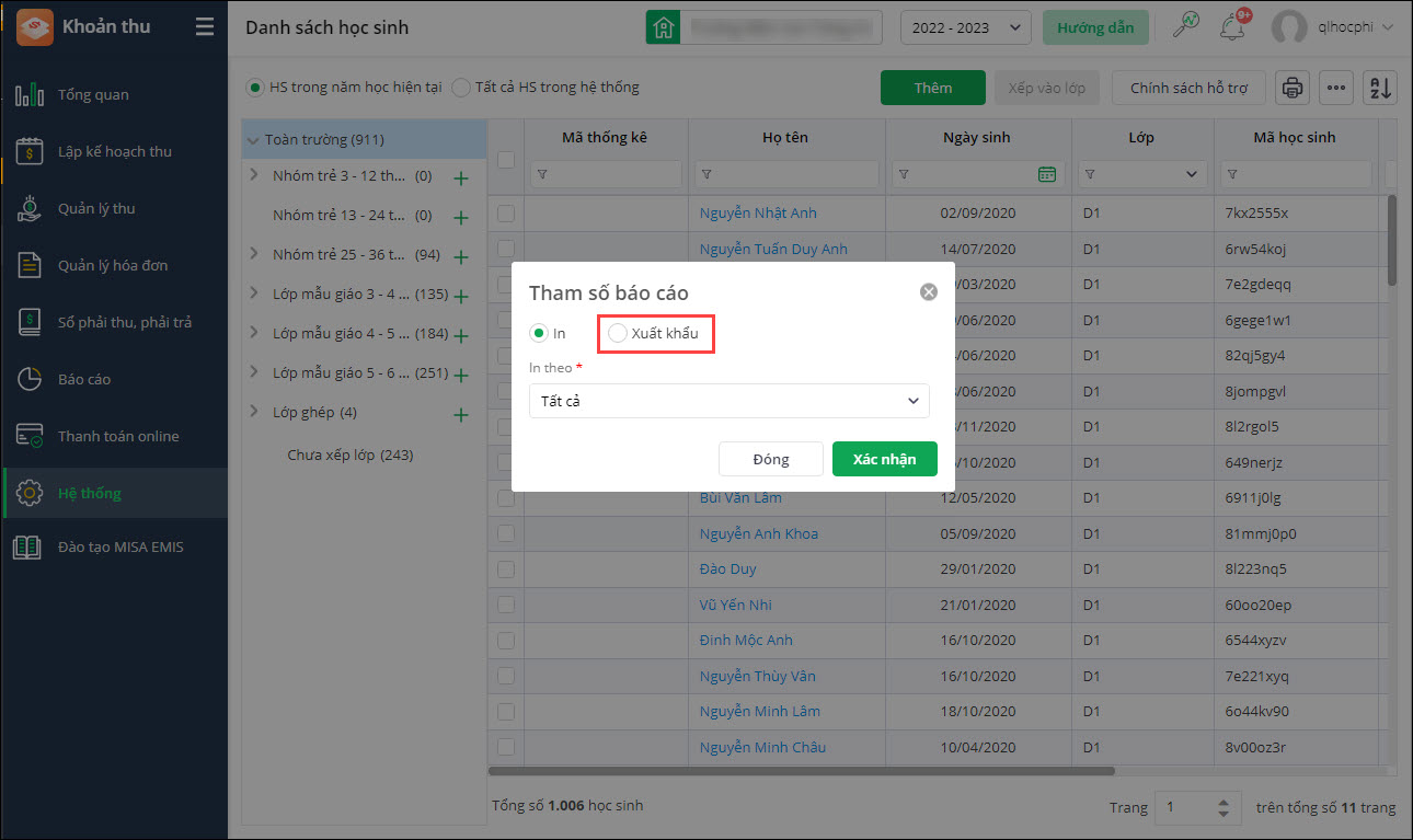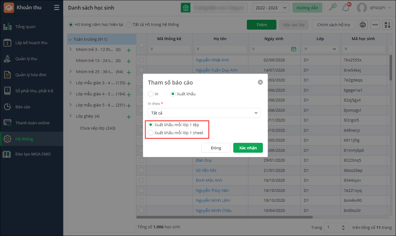 - Kế toán cần xuất danh sách mã học sinh theo từng lớp để gửi file cho GVCN nắm bắt và theo dõi.