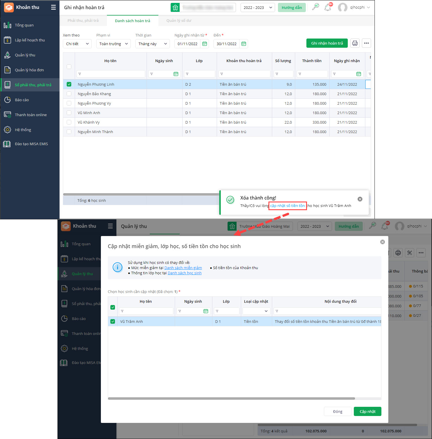 - Tự động tích chọn những học sinh cần cập nhật tiền tồn từ Xóa bản ghi hoàn trả.