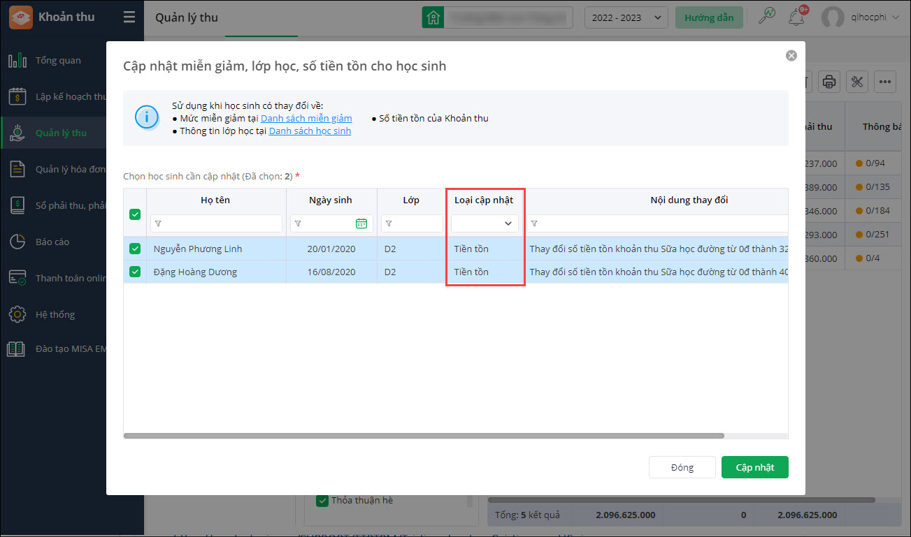 - Tự động tích chọn những học sinh có Loại cập nhật là Tiền tồn.