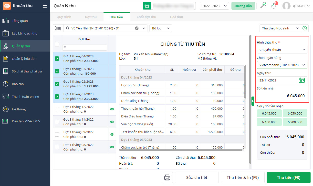 - Sau khi thu tiền và xuất hóa đơn, phần mềm không cho phép chỉnh sửa hình thức thu tiền của học sinh. Nếu muốn chỉnh sửa lại, kế toán phải hủy thu tiền và thu tiền lại của học sinh đó.