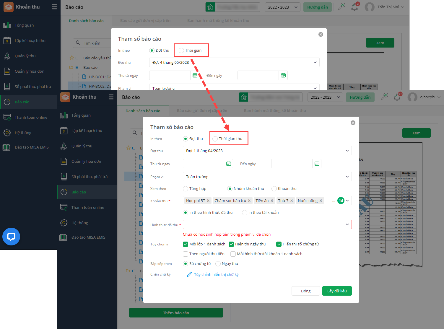 - Quy tắc 2: Khi chọn In theo Thời gian, thay thế phần chọn Thu từ ngày – Đến ngày sang chọn Tháng/Năm hoặc Tùy chọn đi kèm thời gian tương ứng.