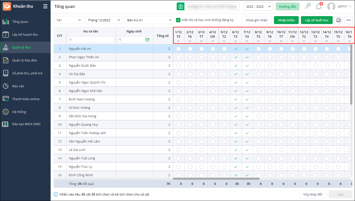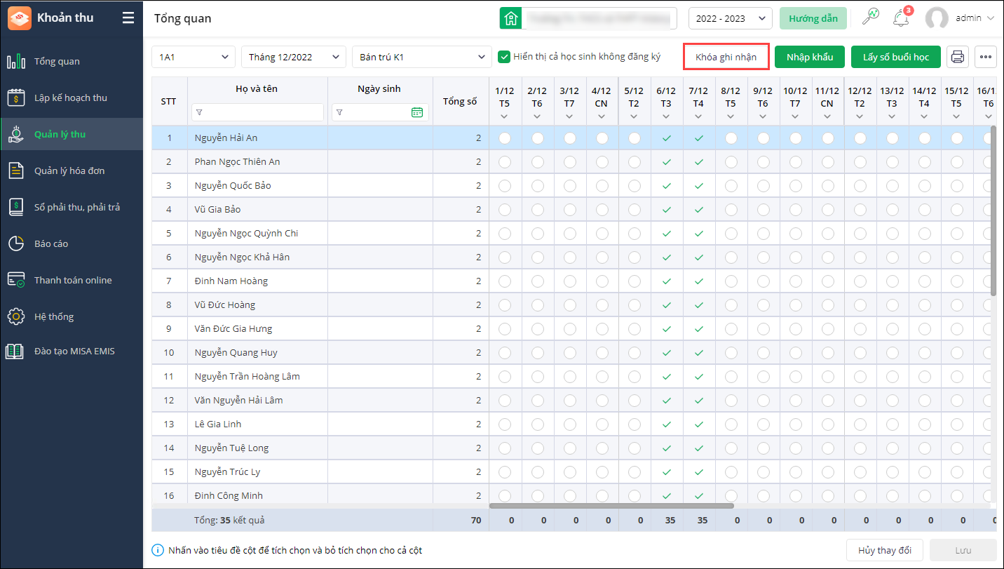 - Bổ sung button Khóa ghi nhận: Khóa ghi nhận khoản thu theo lớp và tháng tương ứng.