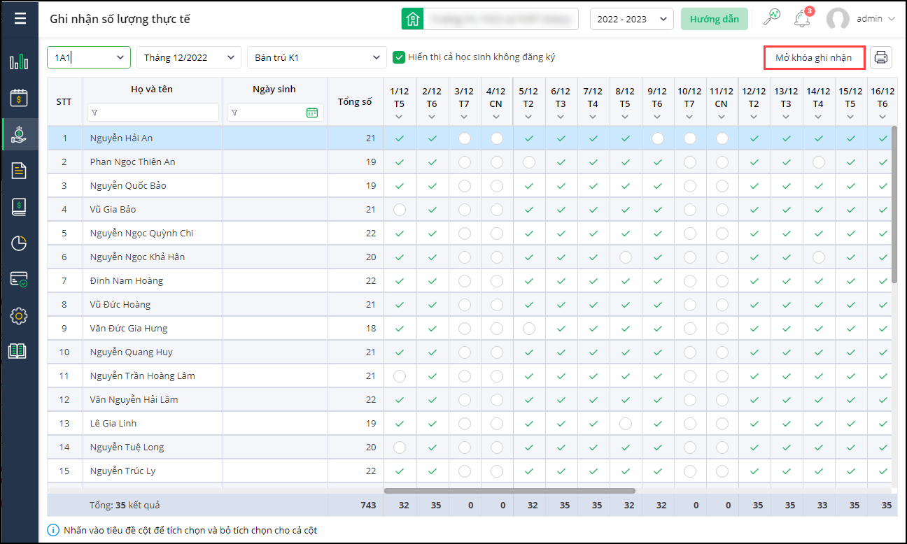 - Tại tài khoản admin, ẩn button Nhập khẩu; Lấy số buổi học và dấu ba chấm. Bổ sung button Mở khóa ghi nhận, kế toán phải mở khóa ghi nhận mới có thể chỉnh sửa.