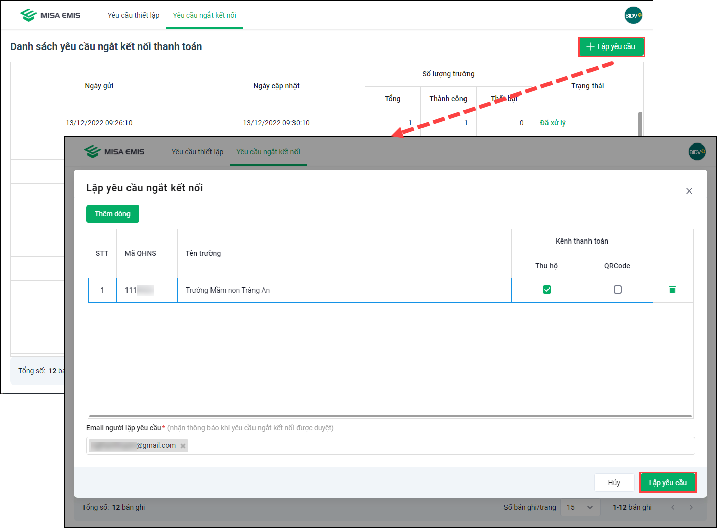 - Ngân hàng/Đối tác thanh toán lập yêu cầu thiết lập kết nối thanh toán không dùng tiền mặt cho nhà trường đến MISA duyệt qua công cụ Thiết lập kết nối thanh toán không dùng tiền mặt.