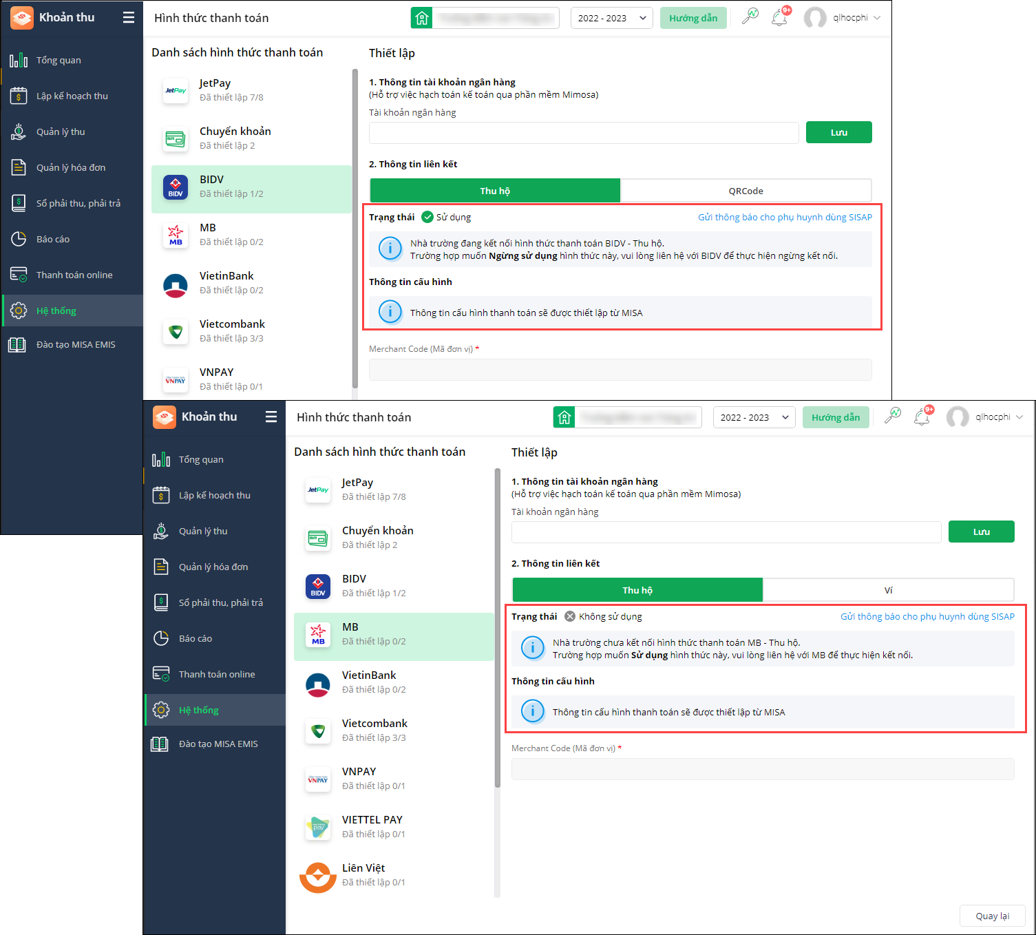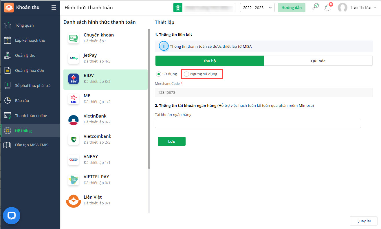 - Trường hợp nhà trường không tiếp tục sử dụng hình thức nào sẽ thông báo cho ngân hàng và ngân hàng báo lại cho MISA để ngắt kết nối hình thức đó.