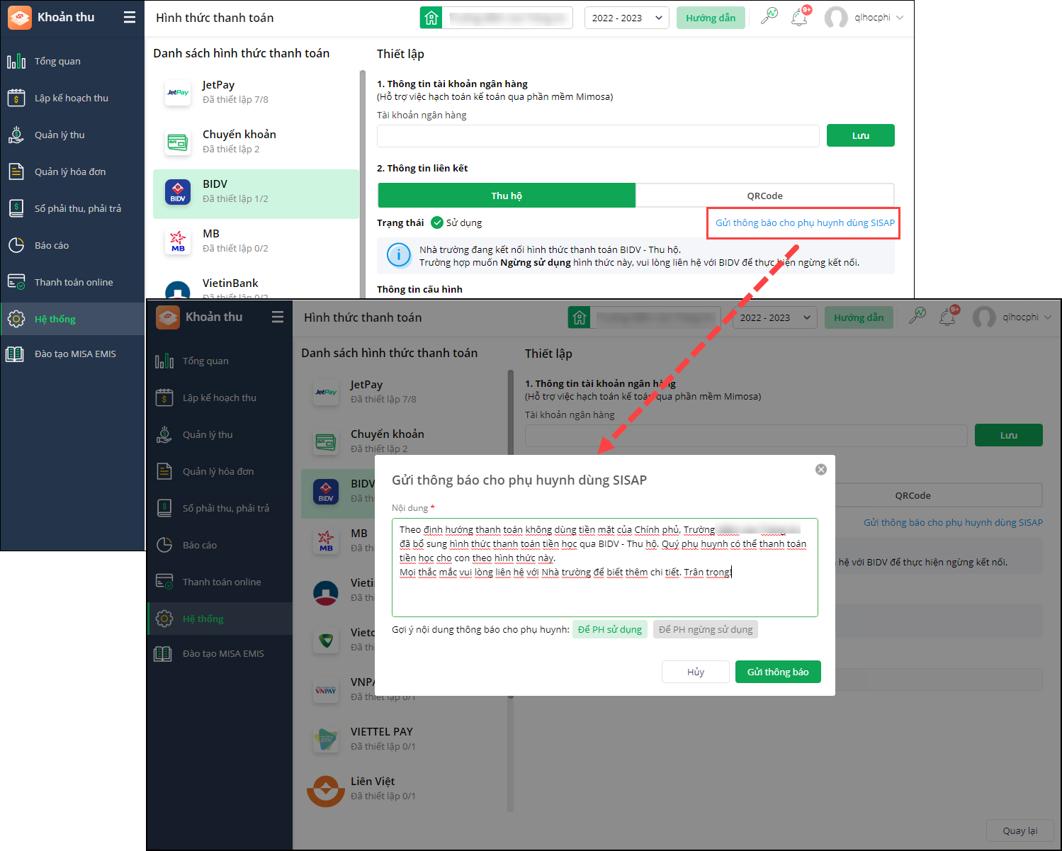 - Bổ sung hướng dẫn cho nhà trường khi muốn sử dụng/ngừng sử dụng hình thức thanh toán.