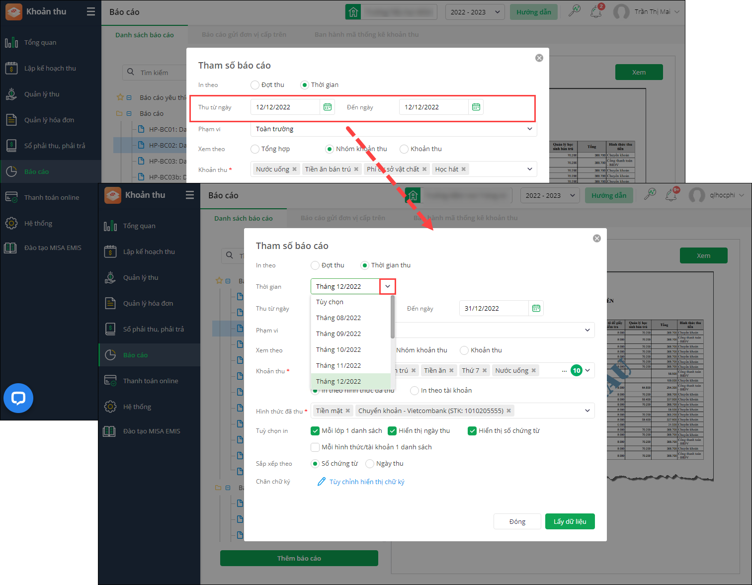 - Quy tắc 2: Khi chọn In theo Thời gian, thay thế phần chọn Thu từ ngày – Đến ngày sang chọn Tháng/Năm hoặc Tùy chọn đi kèm thời gian tương ứng.