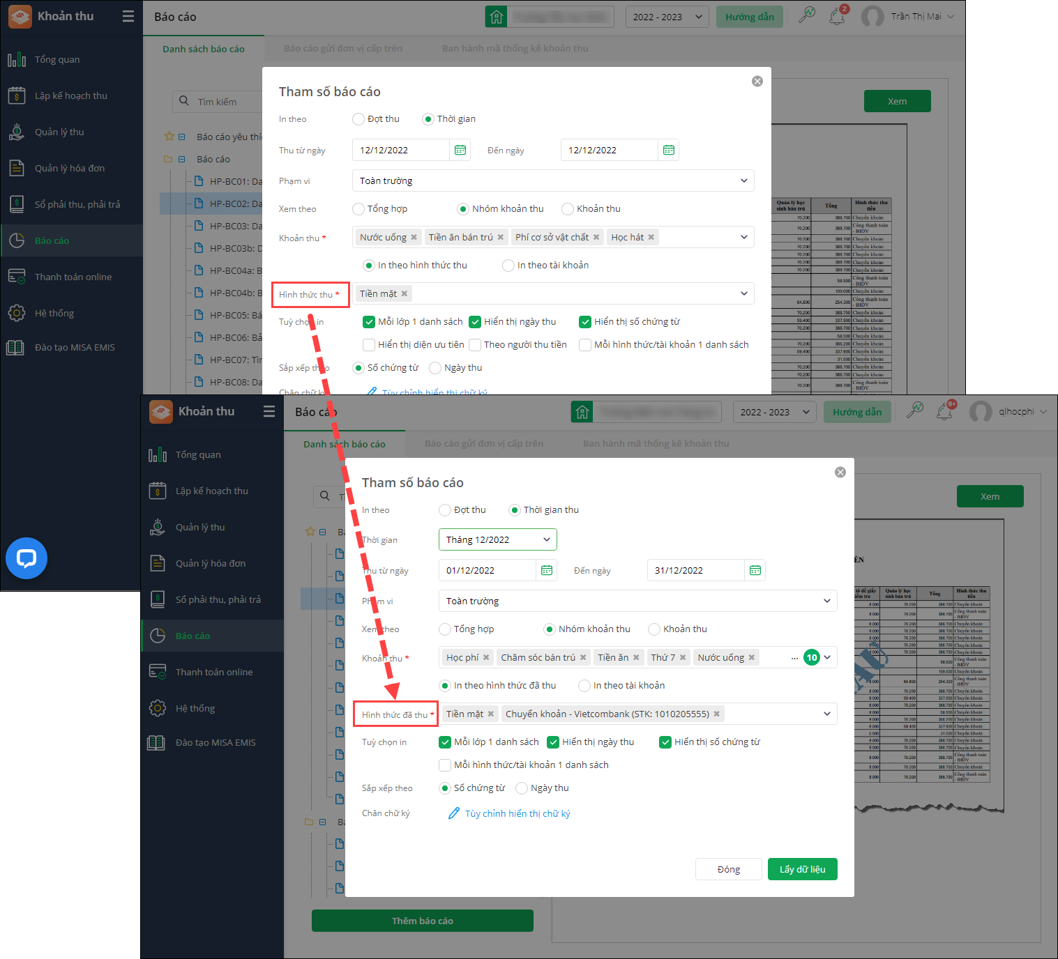 - Bảng tổng hợp thu tiền: 2 mẫu tùy chỉnh (Theo khoản thu và Theo lớp)