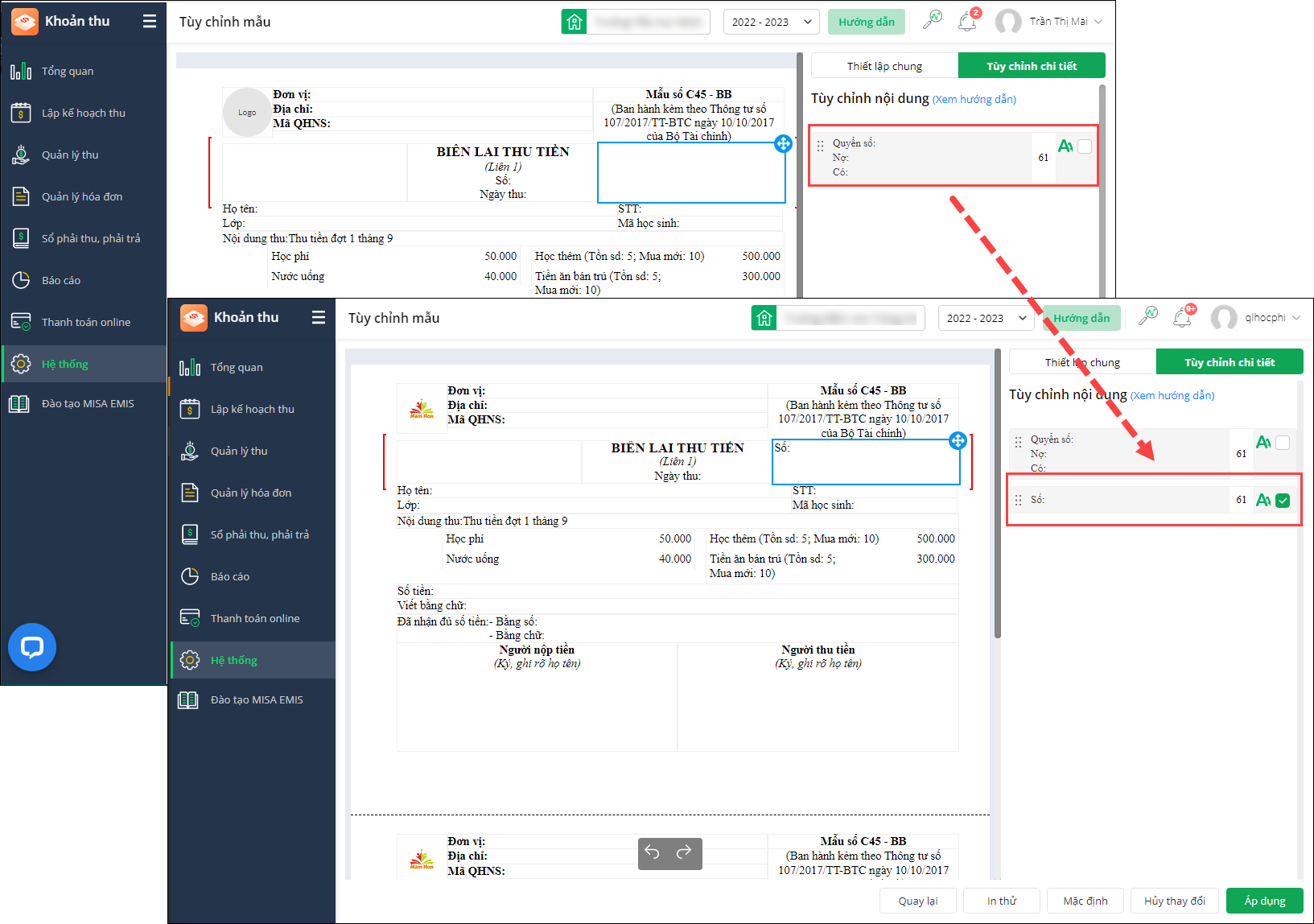 - Tại cụm thông tin Quyển số: bổ sung thông tin Số (viết tắt của Số chứng từ).