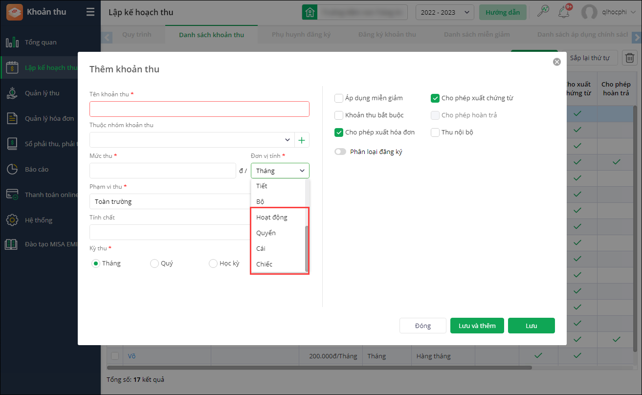 - Tại mục Lập kế hoạch thu\Danh sách khoản thu, khi Thêm mới hoặc Sửa khoản thu sẽ bổ sung các đơn vị tính: