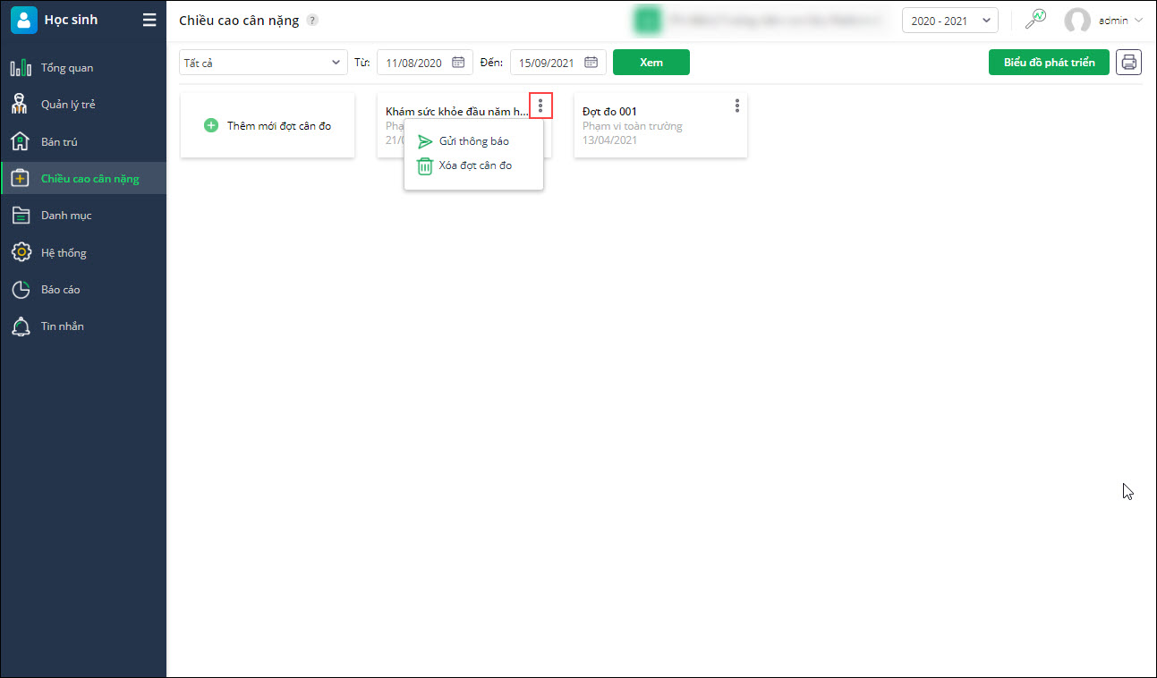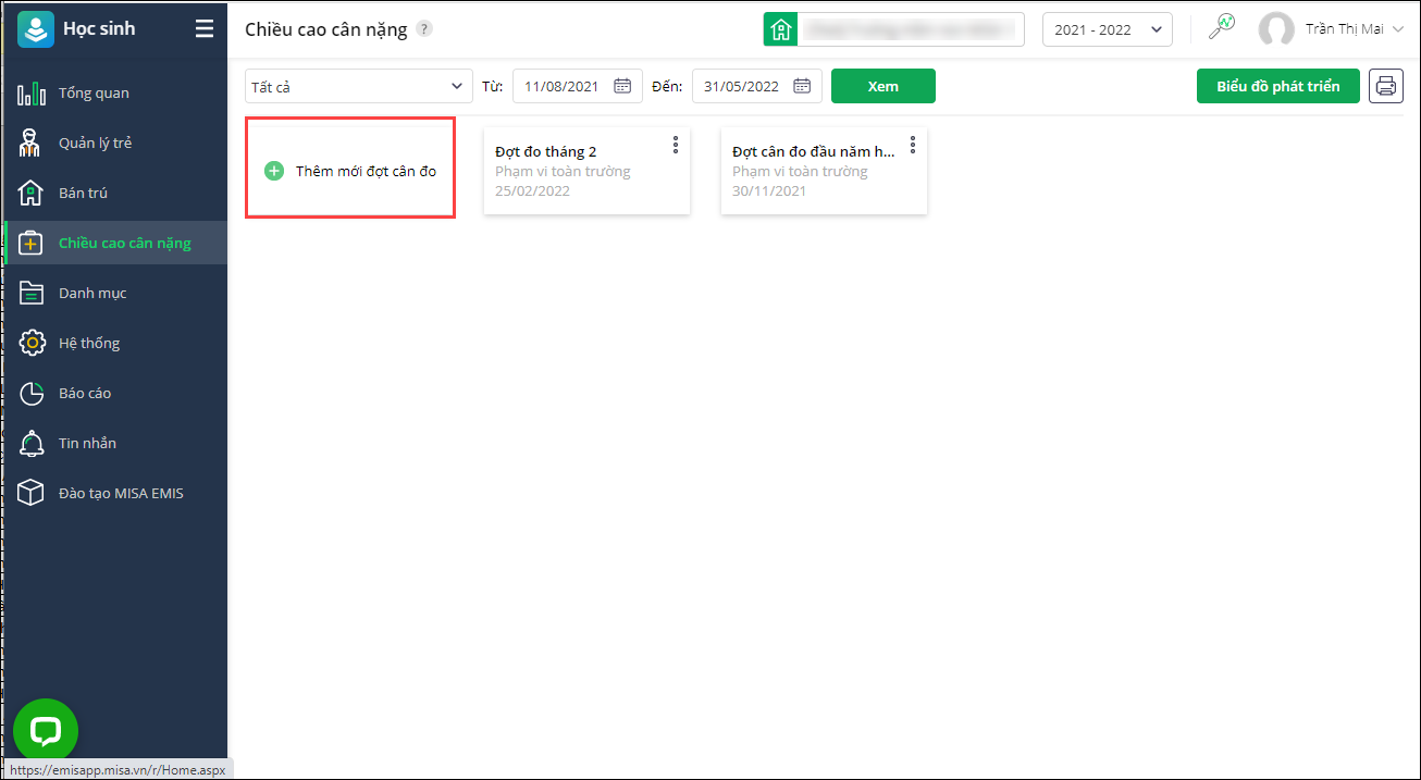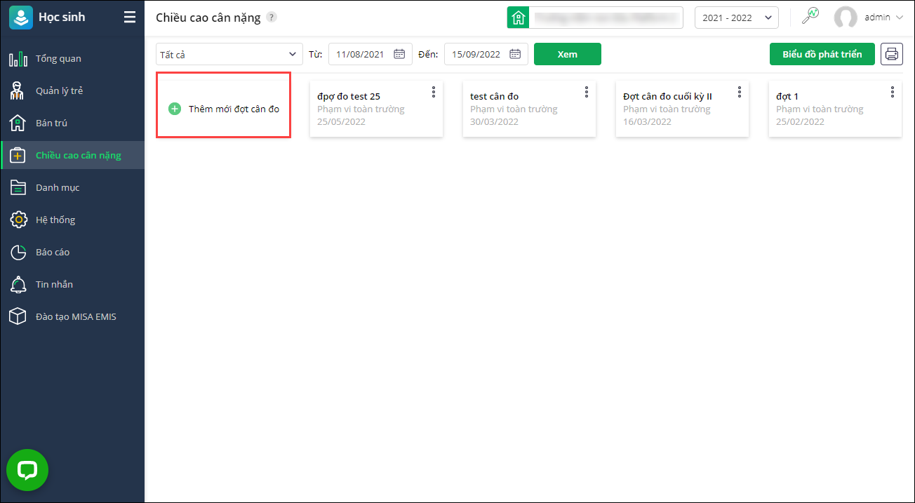 1. Vào phân hệ Học sinh\Chiều cao cân nặng, nhấn Thêm mới đợt cân đo.