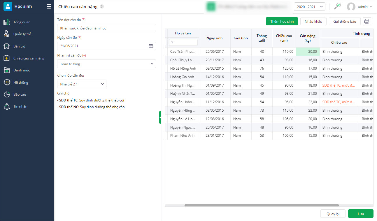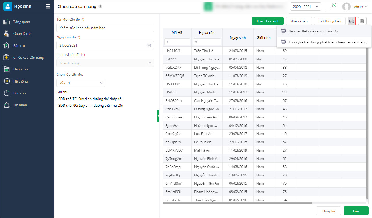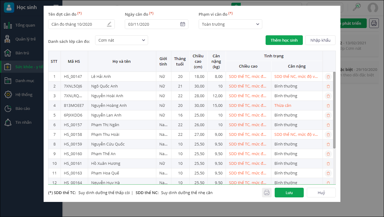 • Chọn Phạm vi danh sách học sinh cần thực hiện cân đo Toàn trường: danh sách toàn bộ học sinh đang học