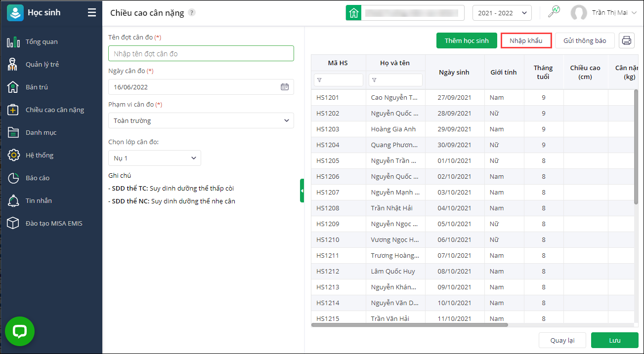 2. Nhập các thông tin: Đợt cân đo, Ngày cân đo. Nhấn Nhập khẩu để tải lên tệp thông tin chiều cao, cân nặng của trẻ có sẵn.