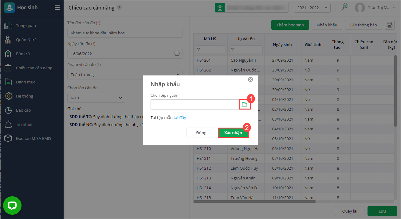Giúp cán bộ dinh dưỡng nhập khẩu số cân đo của học sinh từ tệp có sẵn.
