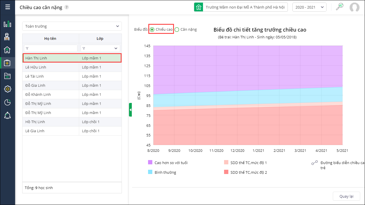 3. Tích chọn Biểu đồ chiều cao để xem Biểu đồ chi tiết tăng trưởng chiều cao của học sinh đó