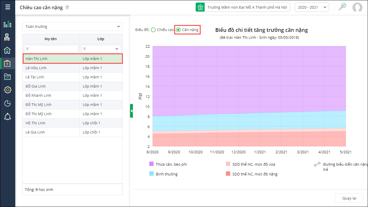 Sau khi ghi nhận kết quả đo chiều cao, cân nặng vào phần mềm, nhà trường theo dõi Biểu đồ tăng trưởng để theo dõi tình trạng phá triển của trẻ.