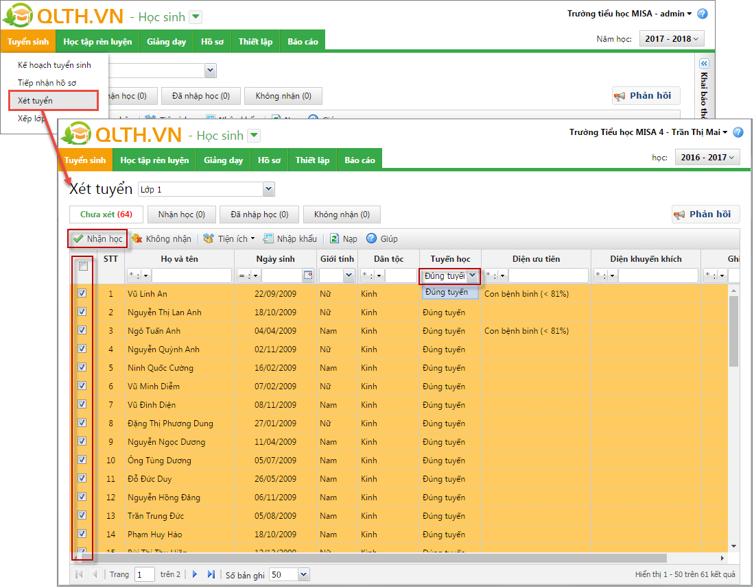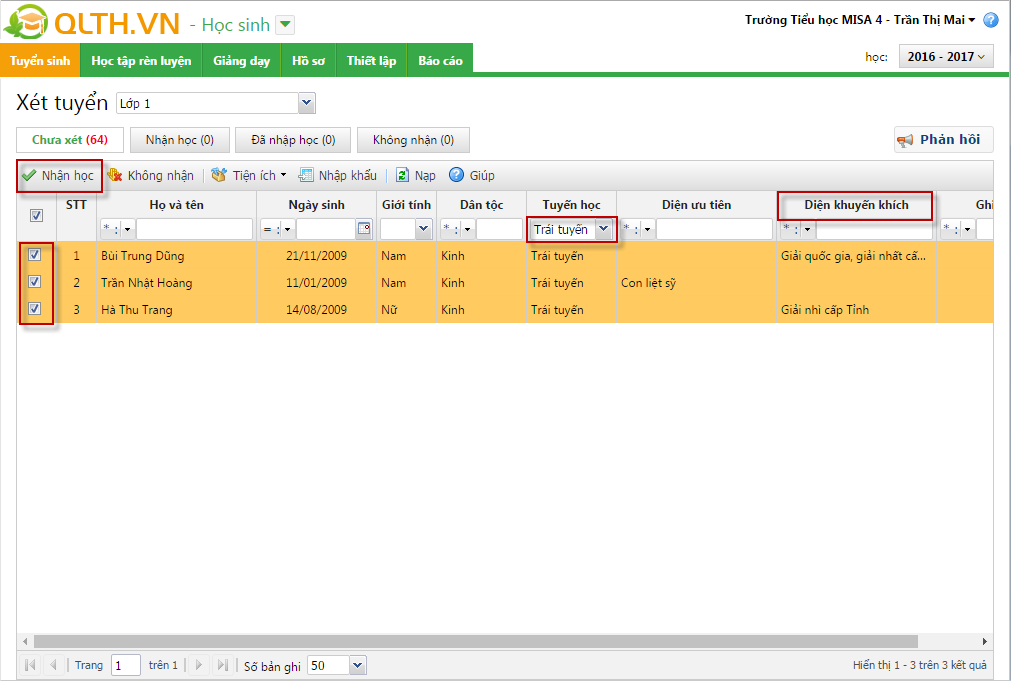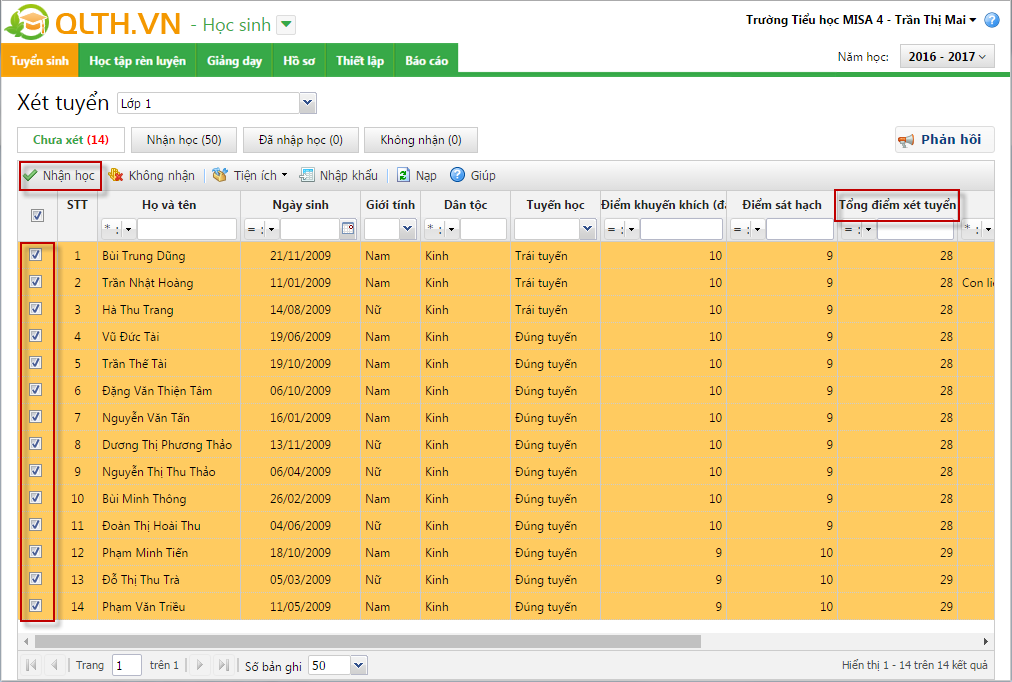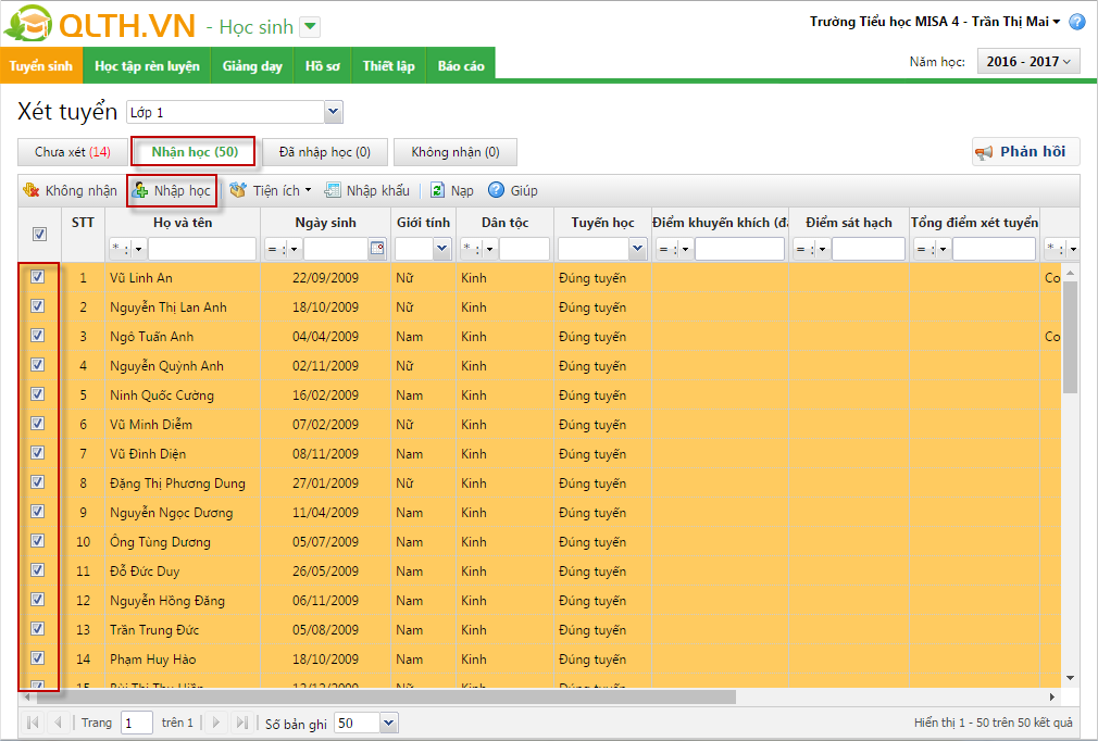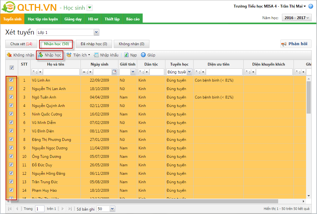 6. Tích chọn các hồ sơ đạt yêu cầu, nhấn Nhận học.
