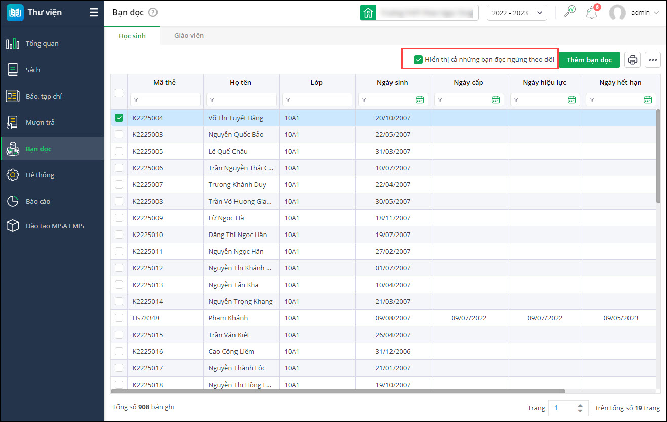 - Với những bạn đọc trong năm không sử dụng (Học sinh thì nghỉ học giữa chừng, giáo viên thì nghỉ sinh, chuyển trường,…) thì vẫn theo dõi để lên báo cáo, thống kế đã phát sinh trước