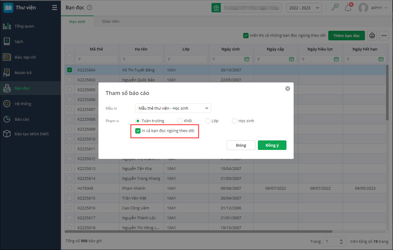 - Khi in thẻ bạn đọc: Tại tham số bổ sung checkbox In cả bạn đọc ngừng theo dõi.