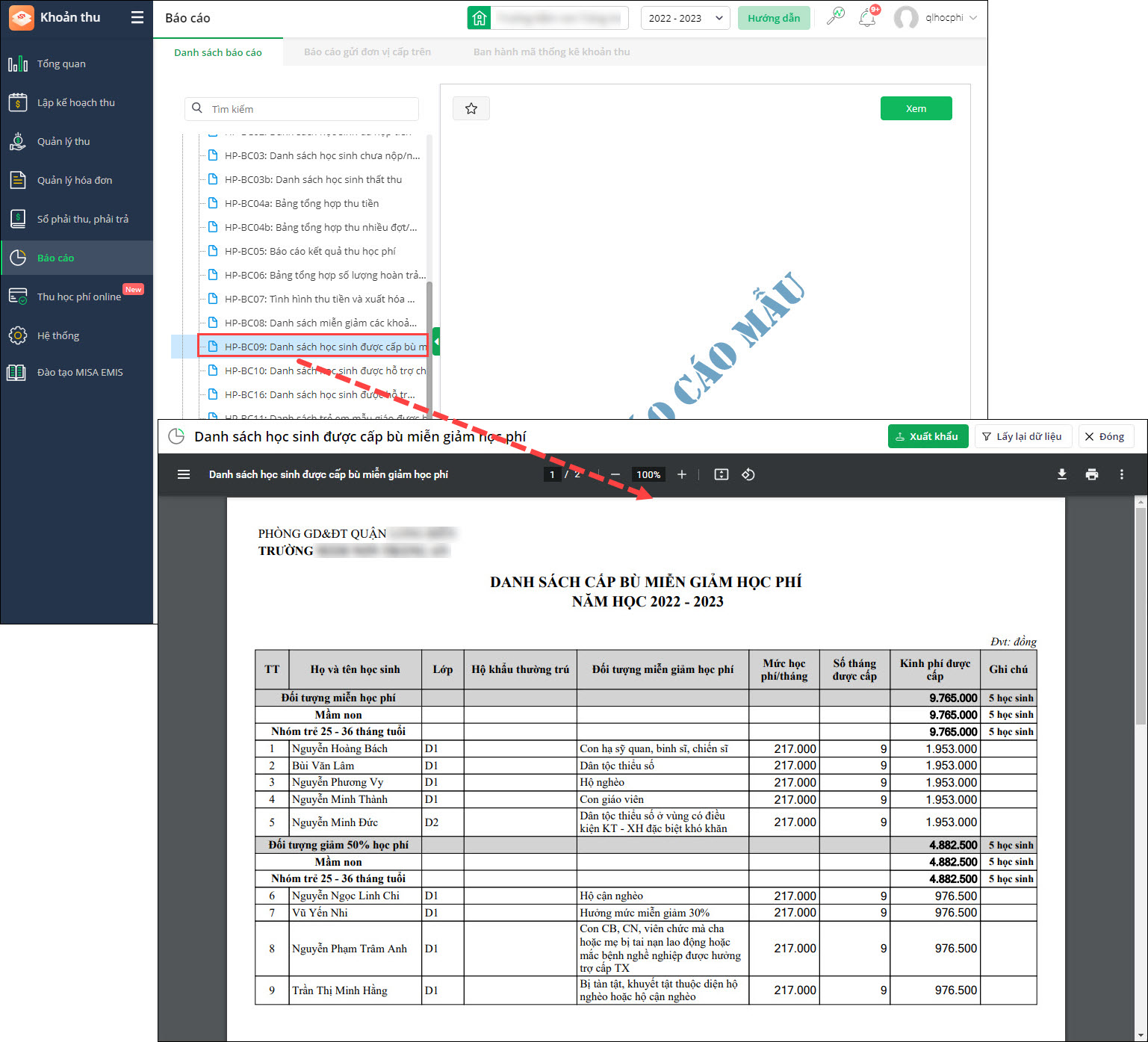 - Tại Báo cáo\Danh sách báo cáo: Bổ sung báo cáo HP-BC09: Danh sách học sinh được cấp bù miễn giảm học phí.