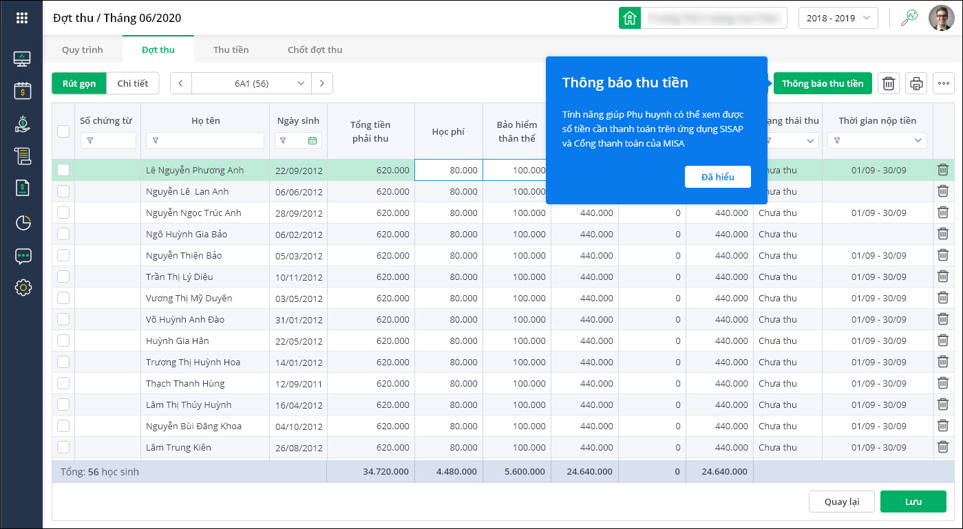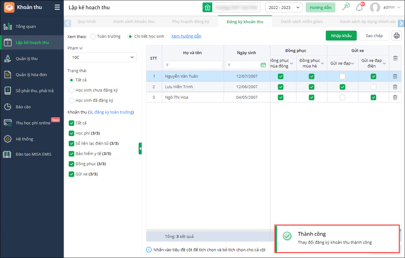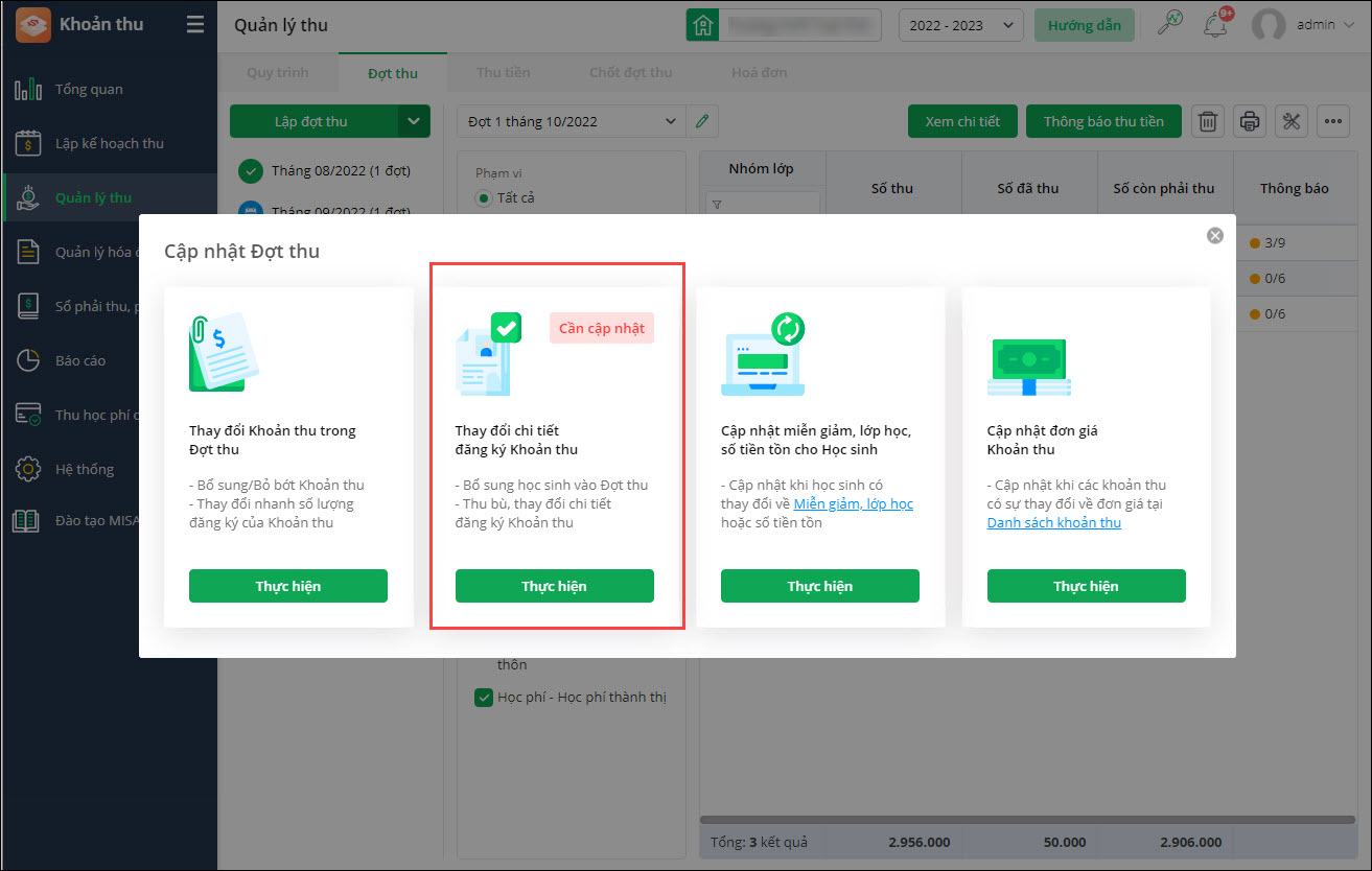 - Kế toán sau khi thay đổi trạng thái đăng ký khoản thu có thể nhanh chóng cập nhật vào đợt thu đã lập để tính toán lại số tiền phải thu của học sinh.