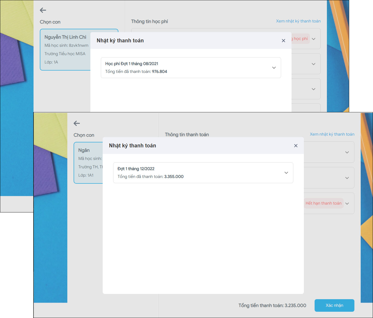 - Khi thanh toán tiền học cho con trên ứng dụng ngân hàng BIDV, phụ huynh có thể xem số tiền cần đóng tương ứng mỗi đợt thu.