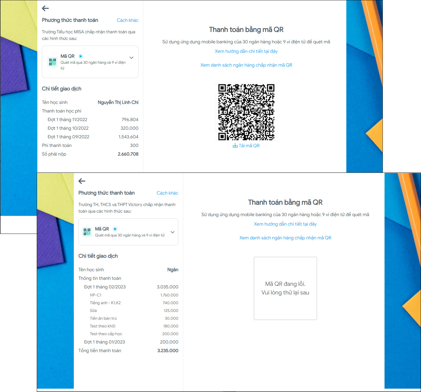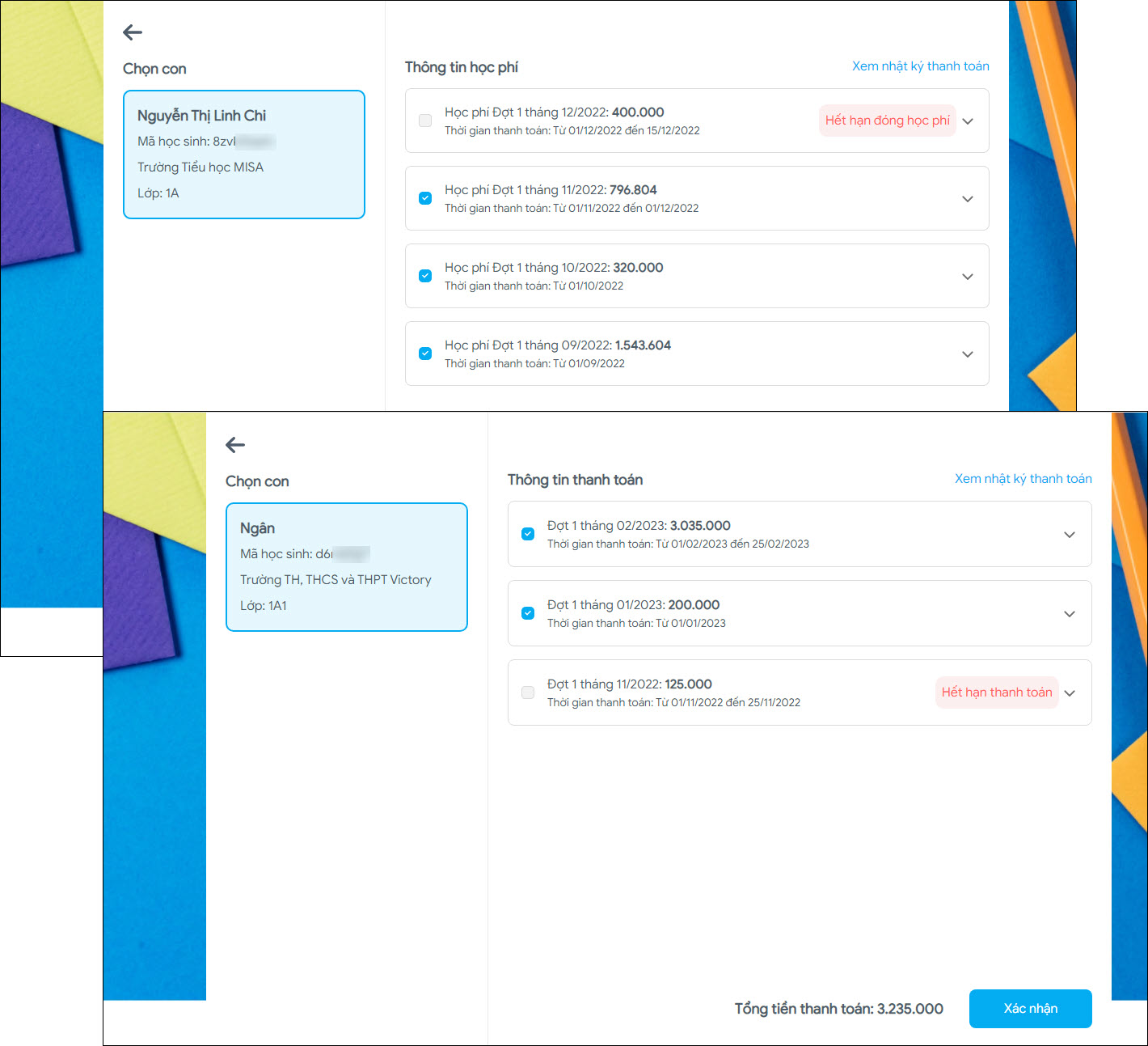 - Thông tin học phí -> Thông tin thanh toán.